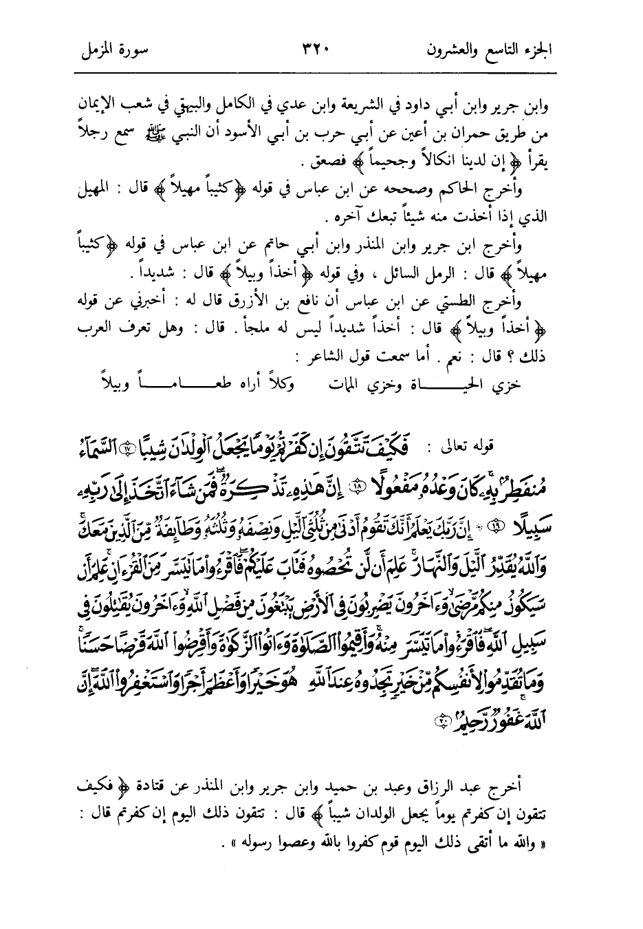 أخرج عبد الرَّزَّاق وَعبد بن حميد وَابْن جرير وَابْن الْمُنْذر عَن قَتَادَة {فَكيف تَتَّقُون إِن كَفرْتُمْ يَوْمًا يَجْعَل الْولدَان شيباً} قَالَ: تَتَّقُون ذَلِك الْيَوْم إِن كَفرْتُمْ قَالَ: وَالله مَا أتقى ذَلِك الْيَوْم قوم كفرُوا بِاللَّه وعصوا رَسُوله
