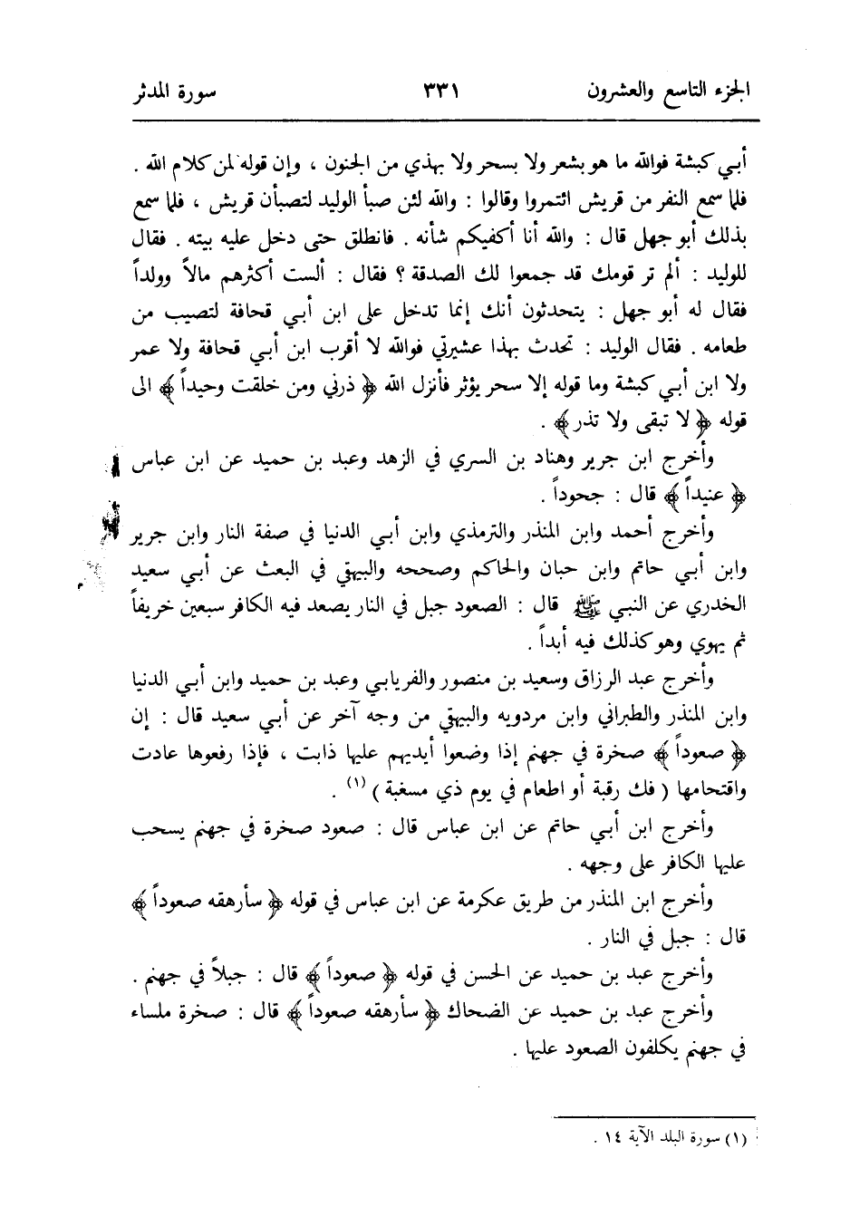 فَقَالَ الْوَلِيد: تحدث بِهَذَا عشيرتي فوَاللَّه لَا أقرب ابْن أبي قُحَافَة وَلَا عمر وَلَا ابْن أبي كَبْشَة وَمَا قَوْله: إِلَّا سحر يُؤثر فَأنْزل الله {ذَرْنِي وَمن خلقت وحيداً} إِلَى قَوْله: {لَا تبقي وَلَا تذر}