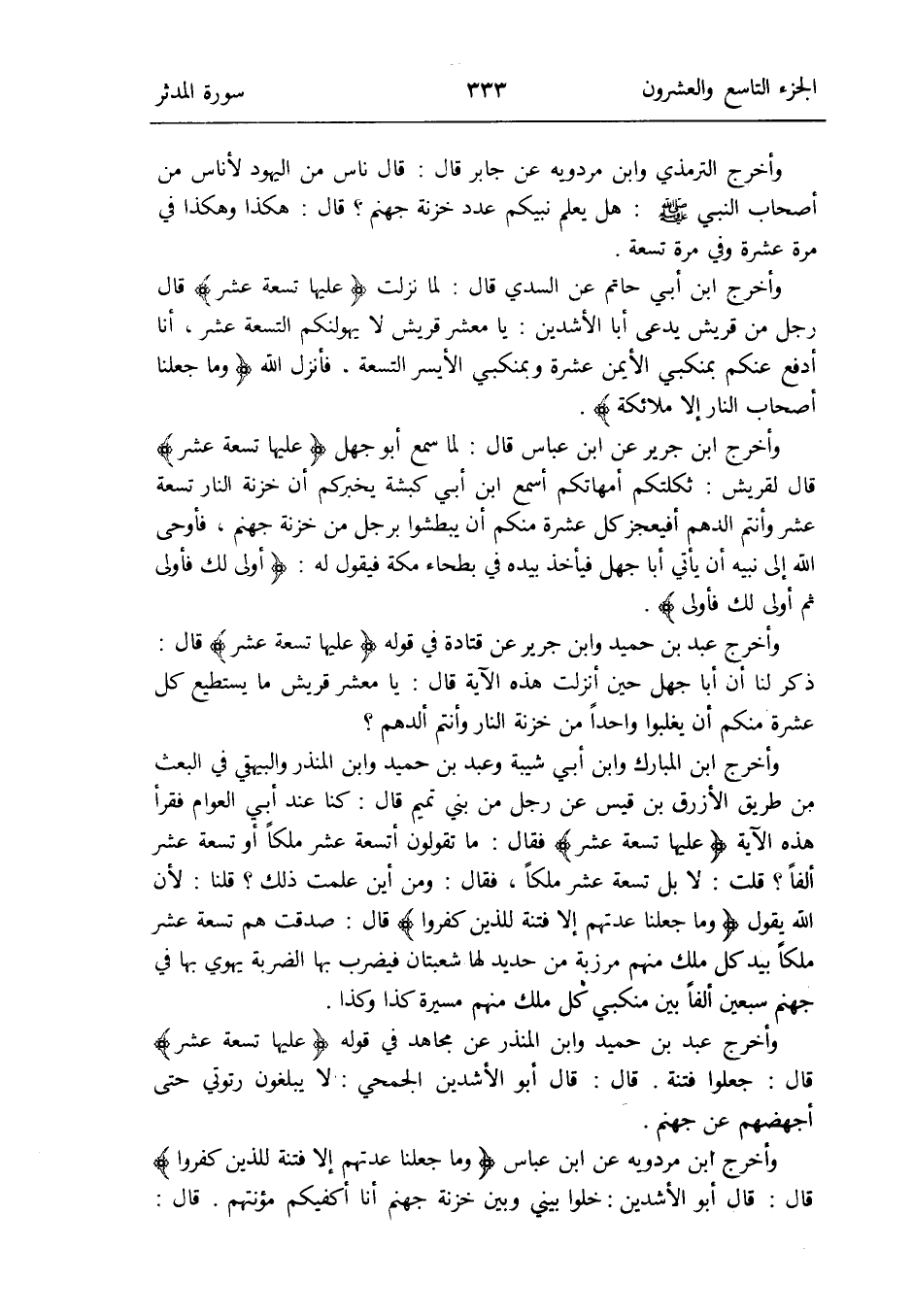 وَأخرج التِّرْمِذِيّ وَابْن مرْدَوَيْه عَن جَابر قَالَ: قَالَ نَاس من الْيَهُود لِأُنَاس من أَصْحَاب النَّبِي صلى الله عَلَيْهِ وَسلم: هَل يعلم نَبِيكُم عدد خَزَنَة جَهَنَّم قَالَ: هَكَذَا وَهَكَذَا فِي مرّة عشرَة وَفِي مرّة تِسْعَة