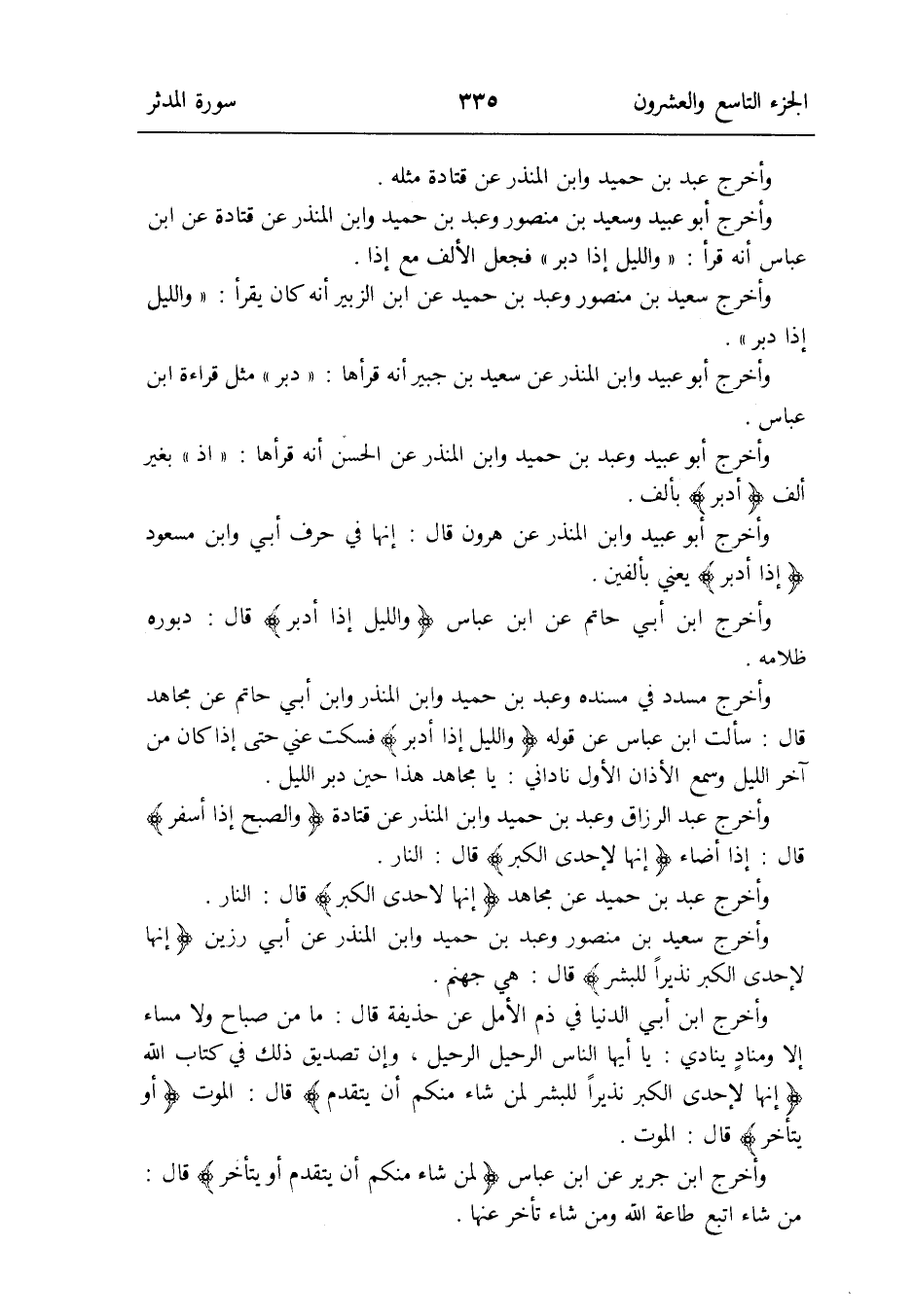 وَأخرج مُسَدّد فِي مُسْنده وَعبد بن حميد وَابْن الْمُنْذر وَابْن أبي حَاتِم عَن مُجَاهِد قَالَ: سَأَلت ابْن عَبَّاس عَن قَوْله: {وَاللَّيْل إِذْ أدبر} فَسكت عني حَتَّى إِذا كَانَ من آخر اللَّيْل وَسمع الْأَذَان الأول ناداني: يَا مُجَاهِد هَذَا حِين دبر اللَّيْل