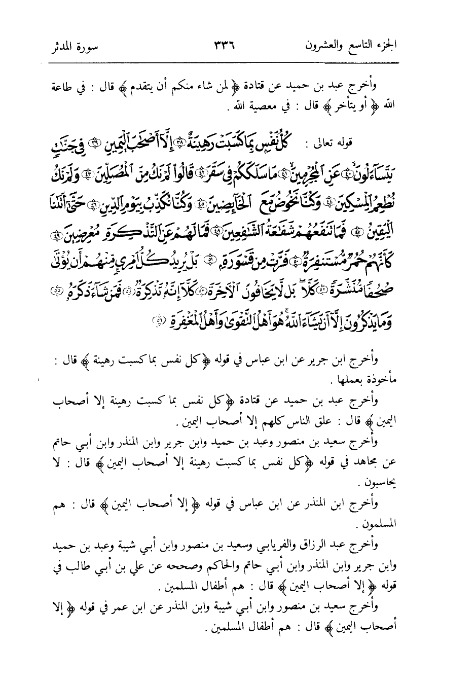 وَأخرج سعيد بن مَنْصُور وَعبد بن حميد وَابْن جرير وَابْن الْمُنْذر وَابْن أبي حَاتِم عَن مُجَاهِد فِي قَوْله: {كل نفس بِمَا كسبت رهينة إِلَّا أَصْحَاب الْيَمين} قَالَ: لَا يحاسبون