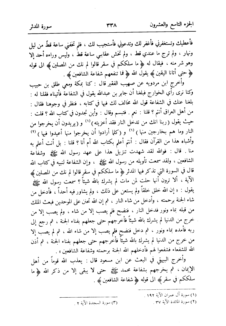 وَأخرج الْبَيْهَقِيّ فِي الْبَعْث عَن ابْن مَسْعُود قَالَ: يعذب الله قوما من أهل الإِيمان ثمَّ يخرجهم بشفاعة مُحَمَّد صلى الله عَلَيْهِ وَسلم حَتَّى لَا يبْقى إِلَّا من ذكر الله {مَا سلككم فِي سقر} إِلَى قَوْله: {شَفَاعَة الشافعين}