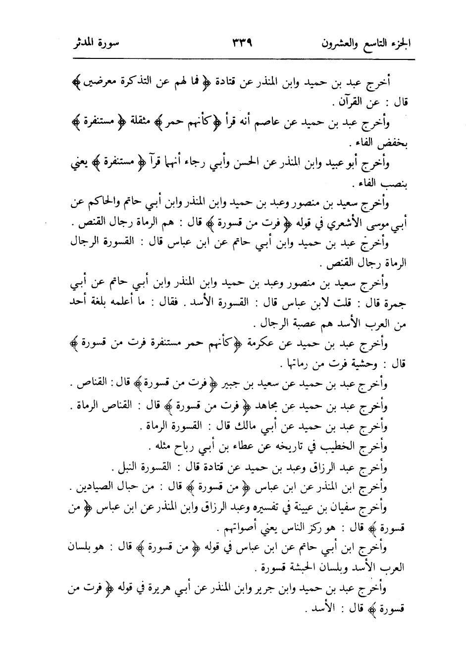وَأخرج عبد بن حميد وَابْن أبي حَاتِم عَن ابْن عَبَّاس قَالَ: القسورة الرِّجَال الرُّمَاة رجال القنص