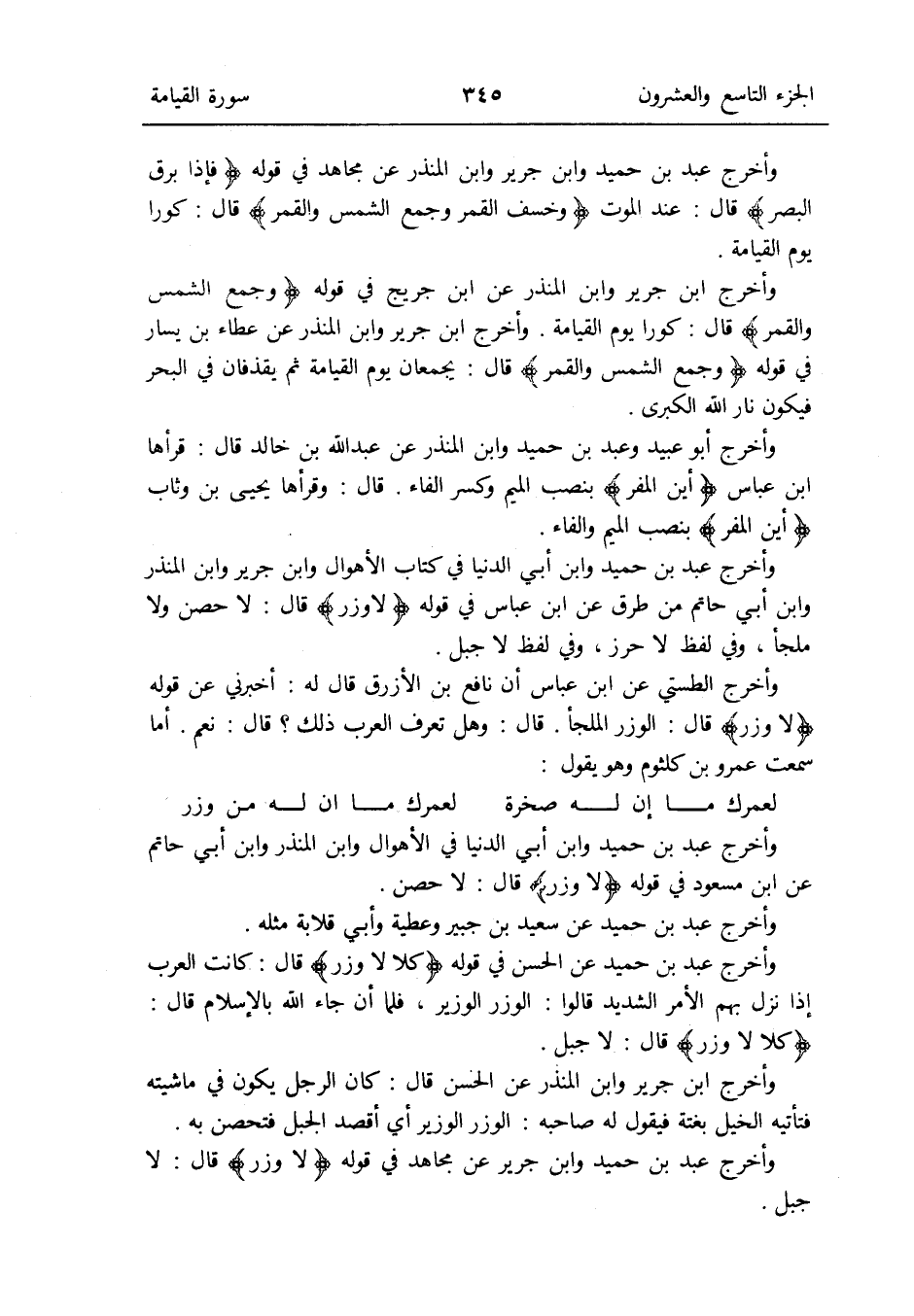 وَأخرج عبد بن حميد وَابْن أبي الدُّنْيَا فِي كتاب الْأَهْوَال وَابْن جرير وَابْن الْمُنْذر وَابْن أبي حَاتِم من طرق عَن ابْن عَبَّاس فِي قَوْله: {لَا وزر} قَالَ: لَا حصن وَلَا ملْجأ وَفِي لفظ لَا حرز وَفِي لفظ لَا جبل