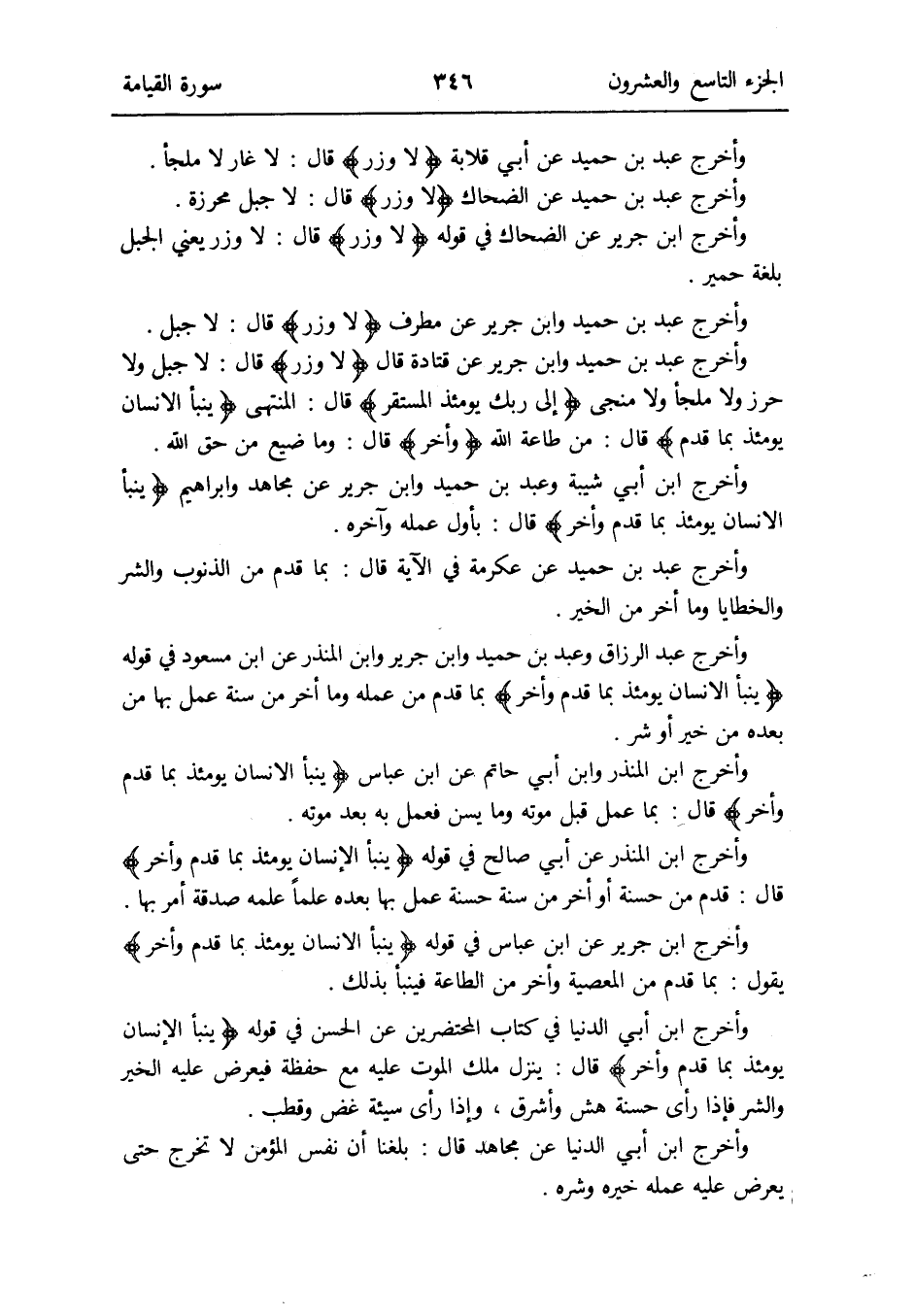 وَأخرج عبد بن حميد وَابْن جرير عَن قَتَادَة قَالَ {لَا وزر} قَالَ: لَا جبل وَلَا حرز وَلَا ملْجأ وَلَا منجى {إِلَى رَبك يَوْمئِذٍ المستقر} قَالَ: الْمُنْتَهى {ينبأ الإِنسان يَوْمئِذٍ بِمَا قدم} قَالَ: من طَاعَة الله {وَأخر} قَالَ: وَمَا ضيع من حق الله
