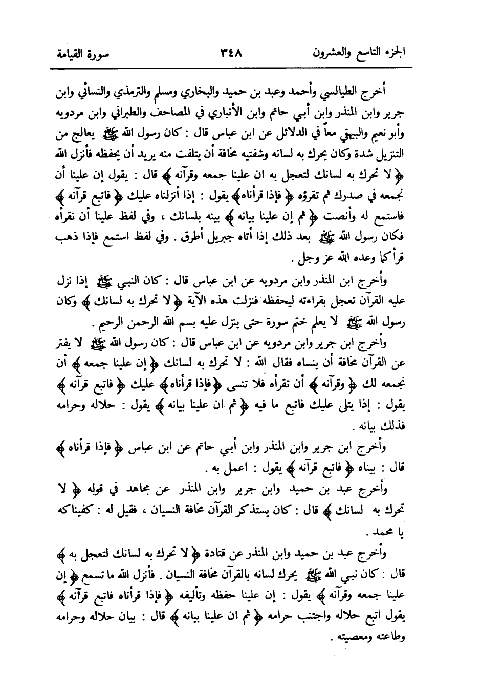 أخرج الطَّيَالِسِيّ وَأحمد وَعبد بن حميد وَالْبُخَارِيّ وَمُسلم وَالتِّرْمِذِيّ وَالنَّسَائِيّ وَابْن جرير وَابْن الْمُنْذر وَابْن أبي حَاتِم وَابْن الْأَنْبَارِي فِي الْمَصَاحِف وَالطَّبَرَانِيّ وَابْن مرْدَوَيْه وَأَبُو نعيم وَالْبَيْهَقِيّ مَعًا فِي الدَّلَائِل عَن ابْن عَبَّاس قَالَ: كَانَ رَسُول الله صلى الله عَلَيْهِ وَسلم يعالج من التَّنْزِيل شدَّة وَكَانَ يُحَرك بِهِ لِسَانه وشفتيه مَخَافَة أَن يتلفت مِنْهُ يُرِيد أَن يحفظه فَأنْزل الله {لَا تحرّك بِهِ لسَانك لتعجل بِهِ إِن علينا جمعه وقرآنه} قَالَ: يَقُول إِن علينا أَن نجمعه فِي صدرك ثمَّ تقرؤه {فَإِذا قرأناه} يَقُول: إِذا أَنزَلْنَاهُ عَلَيْك {فَاتبع قرآنه} فاستمع لَهُ وأنصت {ثمَّ إِن علينا بَيَانه} بَينه بلسانك وَفِي لفظ علينا أَن نقرأه فَكَانَ رَسُول الله صلى الله عَلَيْهِ وَسلم بعد ذَلِك إِذا أَتَاهُ جِبْرِيل أطرق
