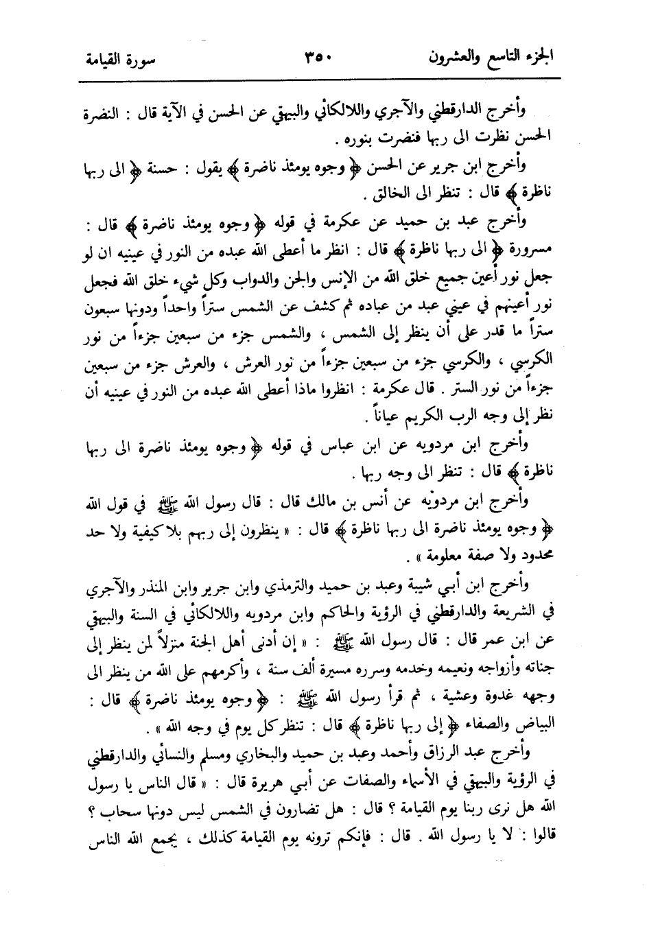 وَأخرج عبد الرَّزَّاق وَأحمد وَعبد بن حميد وَالْبُخَارِيّ وَمُسلم وَالنَّسَائِيّ وَالدَّارَقُطْنِيّ فِي الرُّؤْيَة وَالْبَيْهَقِيّ فِي الْأَسْمَاء وَالصِّفَات عَن أبي هُرَيْرَة قَالَ: قَالَ النَّاس يَا رَسُول الله هَل نرى رَبنَا يَوْم الْقِيَامَة قَالَ: هَل تضَارونَ فِي الشَّمْس لَيْسَ دونهَا سَحَاب قَالُوا: لَا يَا رَسُول الله