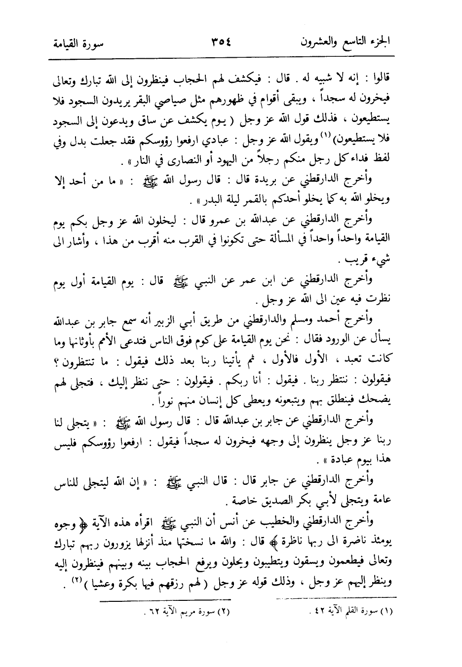 وَأخرج الدَّارَقُطْنِيّ عَن جَابر بن عبد الله قَالَ: قَالَ رَسُول الله صلى الله عَلَيْهِ وَسلم: يتجلى لنا رَبنَا عز وَجل ينظرُونَ إِلَى وَجهه فَيَخِرُّونَ لَهُ سجدا فَيَقُول: ارْفَعُوا رؤوسكم فَلَيْسَ هَذَا بِيَوْم عبَادَة