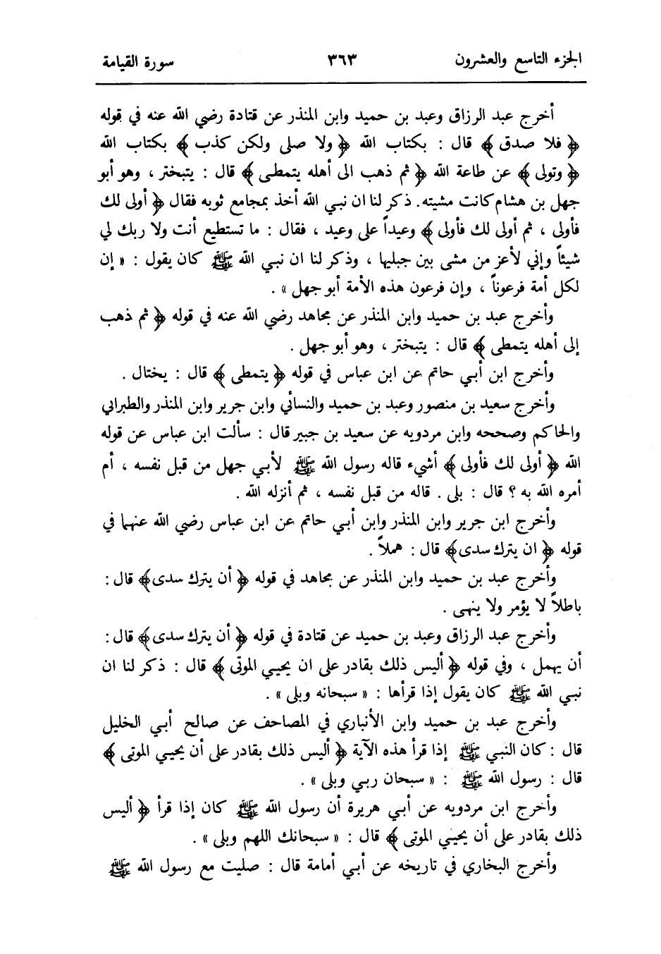وَأخرج عبد الرَّزَّاق وَعبد بن حميد وَابْن الْمُنْذر عَن قَتَادَة رَضِي الله عَنهُ فِي قَوْله: {فَلَا صدق} قَالَ: بِكِتَاب الله {وَلَا صلى وَلَكِن كذب} بِكِتَاب الله {وَتَوَلَّى} عَن طَاعَة الله {ثمَّ ذهب إِلَى أَهله يتمطى} قَالَ: يتبختر وَهُوَ أَبُو جهل بن هِشَام كَانَت مشيته
