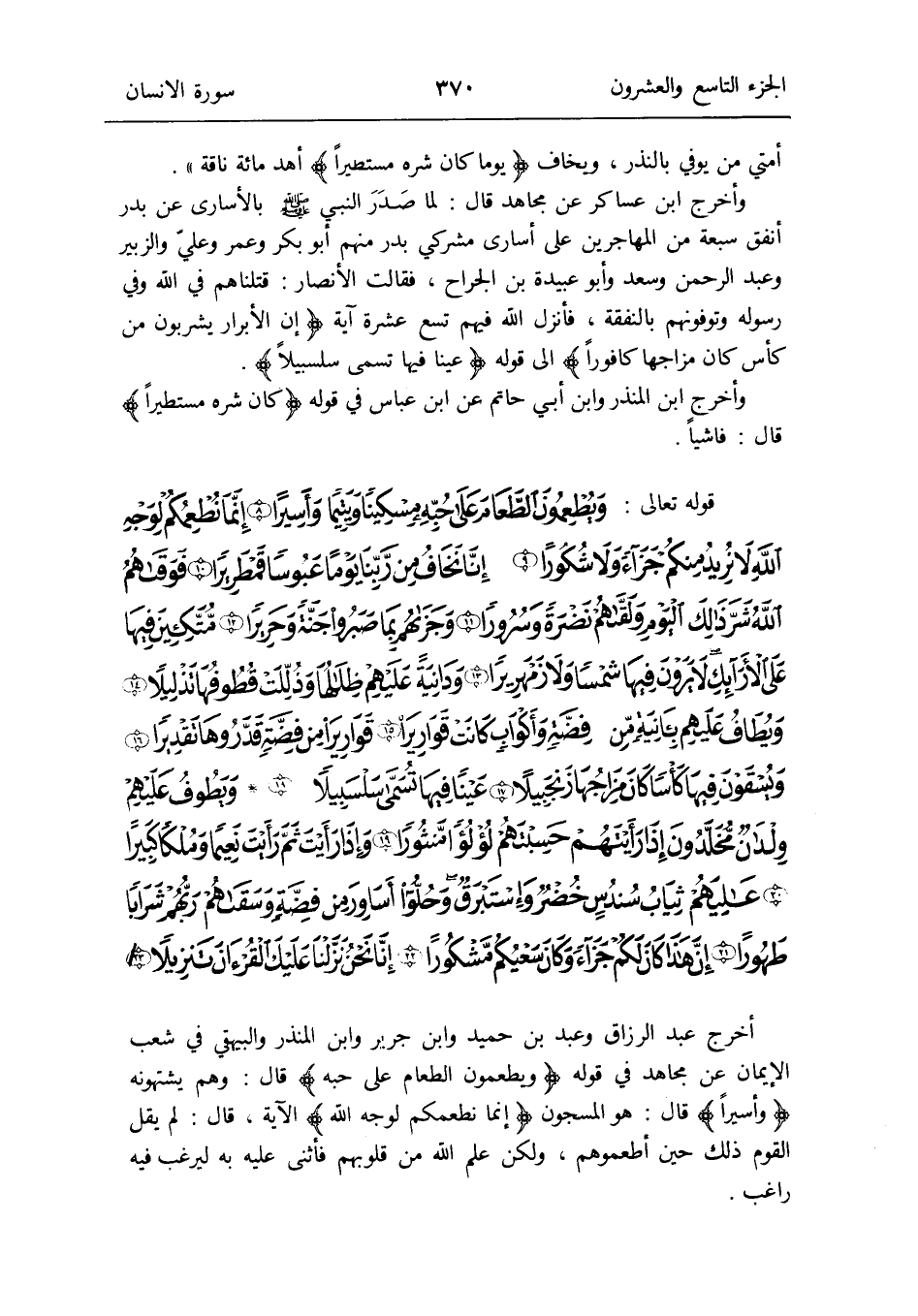 أخرج عبد الرَّزَّاق وَعبد بن حميد وَابْن جرير وَابْن الْمُنْذر وَالْبَيْهَقِيّ فِي شعب الإِيمان عَن مُجَاهِد فِي قَوْله: {ويطعمون الطَّعَام على حبه} قَالَ: وهم يشتهونه {وأسيراً} قَالَ: هُوَ المسجون {إِنَّمَا نطعمكم لوجه الله} الْآيَة قَالَ: لم يقل الْقَوْم ذَلِك حِين أطعموهم وَلَكِن علم الله من قُلُوبهم فَأثْنى عَلَيْهِ بِهِ ليرغب فِيهِ رَاغِب