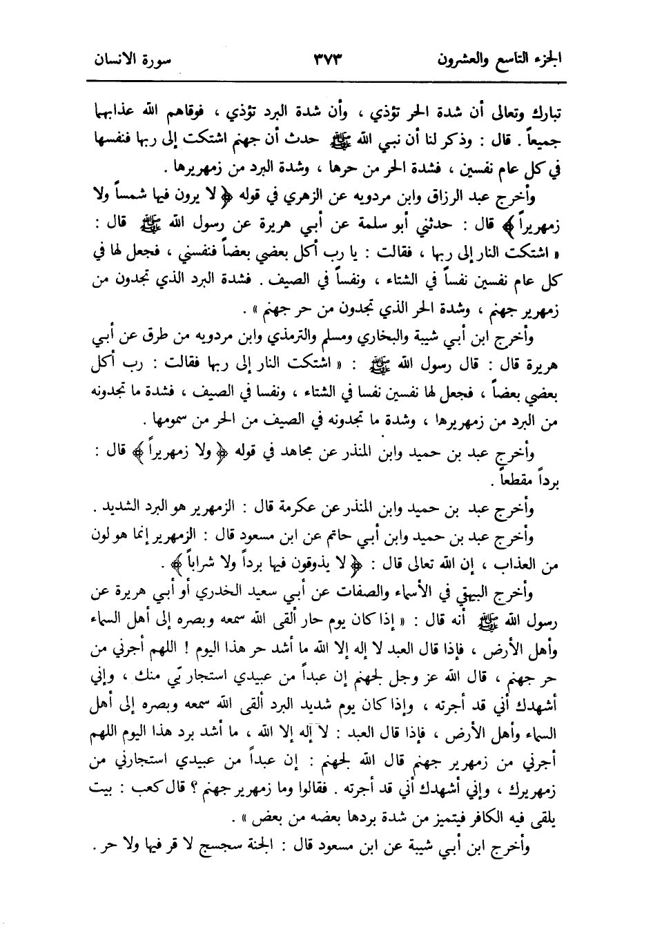 وَأخرج عبد الرَّزَّاق وَابْن مرْدَوَيْه عَن الزُّهْرِيّ فِي قَوْله: {لَا يرَوْنَ فِيهَا شمساً وَلَا زمهريراً} قَالَ: حَدثنِي أَبُو سَلمَة عَن أبي هُرَيْرَة عَن رَسُول الله صلى الله عَلَيْهِ وَسلم قَالَ: اشتكت النَّار إِلَى رَبهَا فَقَالَت: يَا رب أكل بَعْضِي بَعْضًا فنفسني فَجعل لَهَا فِي كل عَام نفسين نفسا فِي الشتَاء ونفساً فِي الصَّيف