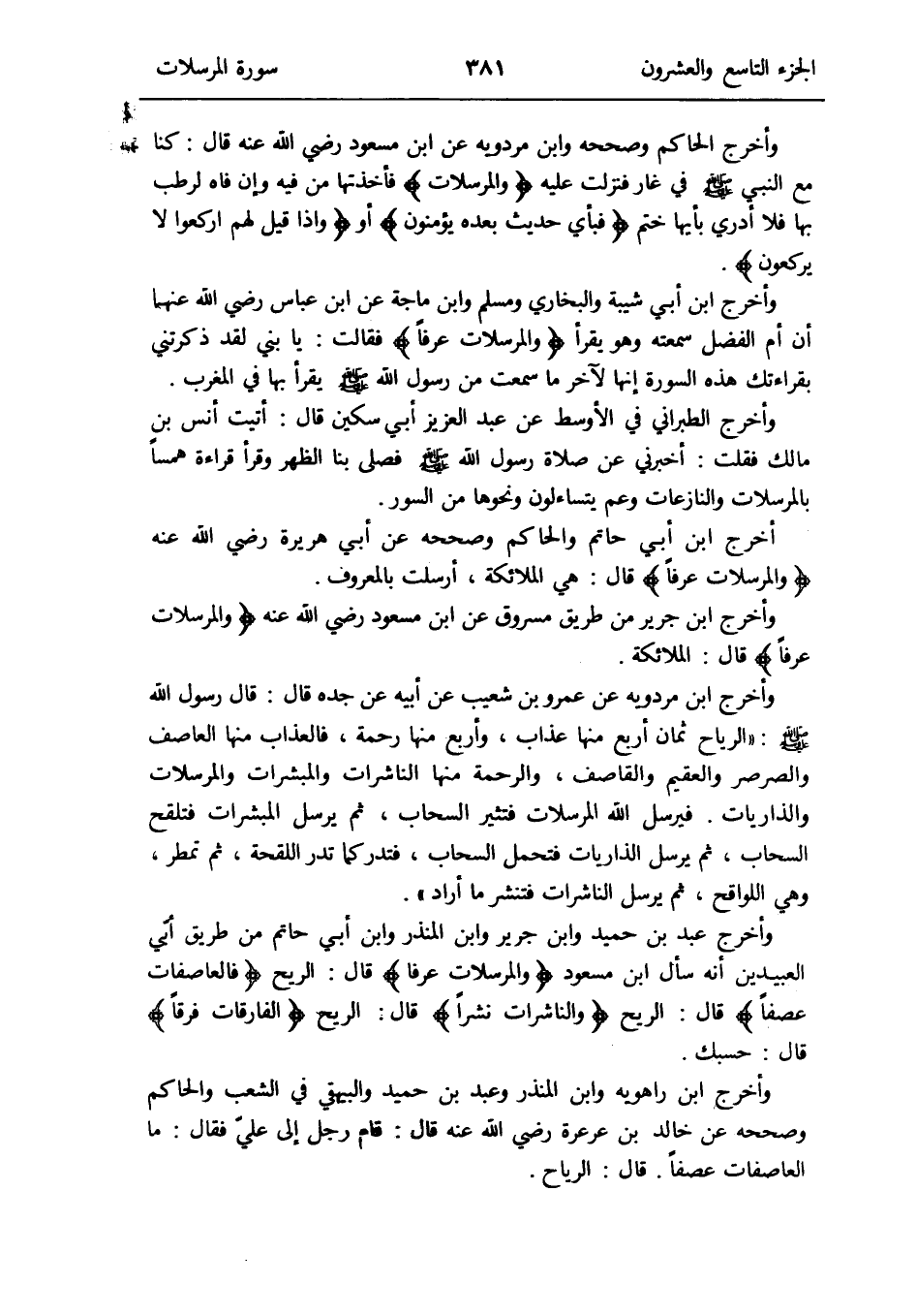 وَأخرج ابْن جرير من طَرِيق مَسْرُوق عَن ابْن مَسْعُود رَضِي الله عَنهُ {والمرسلات عرفا} قَالَ: الْمَلَائِكَة