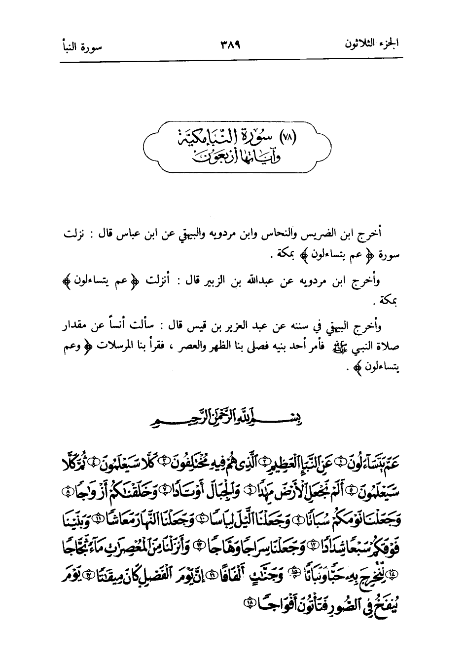 مُقَدّمَة السُّورَة أخرج ابْن الضريس والنحاس وَابْن مرْدَوَيْه وَالْبَيْهَقِيّ عَن ابْن عَبَّاس قَالَ: نزلت سُورَة {عَم يتساءلون} بِمَكَّة