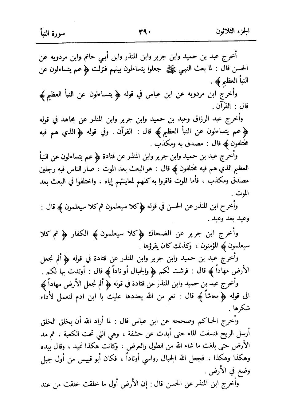 وَأخرج عبد بن حميد وَابْن جرير وَابْن الْمُنْذر عَن قَتَادَة {عَم يتساءلون عَن النبإ الْعَظِيم الَّذِي هم فِيهِ مُخْتَلفُونَ} قَالَ: هُوَ الْبَعْث بعد الْمَوْت صَار النَّاس فِيهِ رجلَيْنِ مُصدق ومكذب فَأَما الْمَوْت فاقروا بِهِ كلهم لمعاينتهم إِيَّاه وَاخْتلفُوا فِي الْبَعْث بعد الْمَوْت