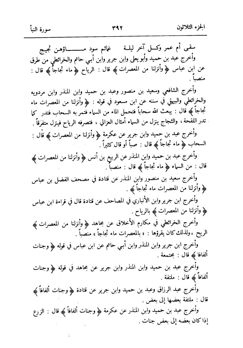 سقى أم عمر وكل آخر لَيْلَة غمائم سود ماؤهن ثجيج وَأخرج عبد بن حميد وَأَبُو يعلى وَابْن جرير وَابْن أبي حَاتِم والخرائطي من طرق عَن ابْن عَبَّاس {وأنزلنا من المعصرات} قَالَ: الرِّيَاح {مَاء ثجاجاً} قَالَ: منصباً