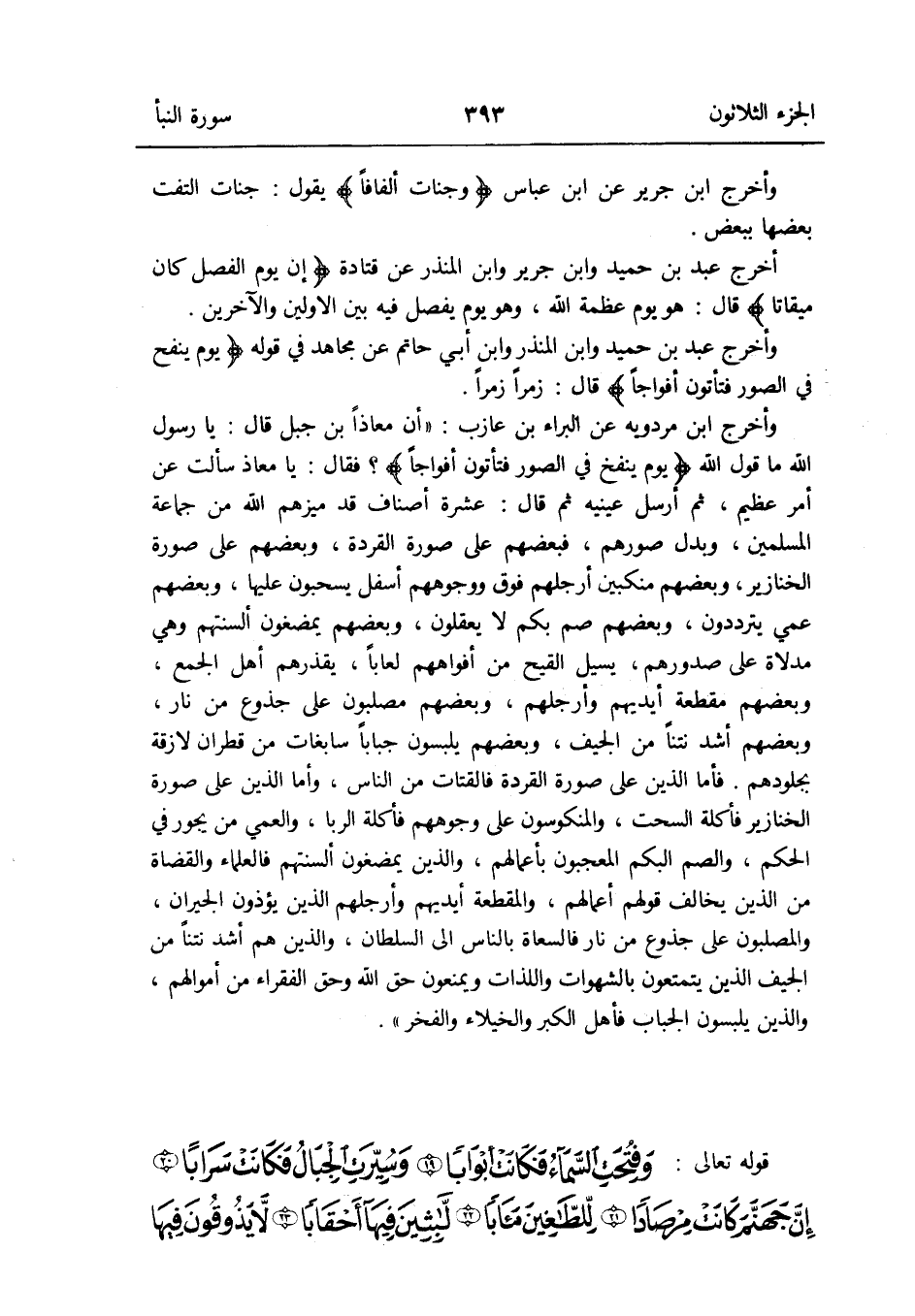 وَأخرج ابْن جرير عَن ابْن عَبَّاس {وجنات ألفافاً} يَقُول: جنَّات الْتفت بَعْضهَا بِبَعْض