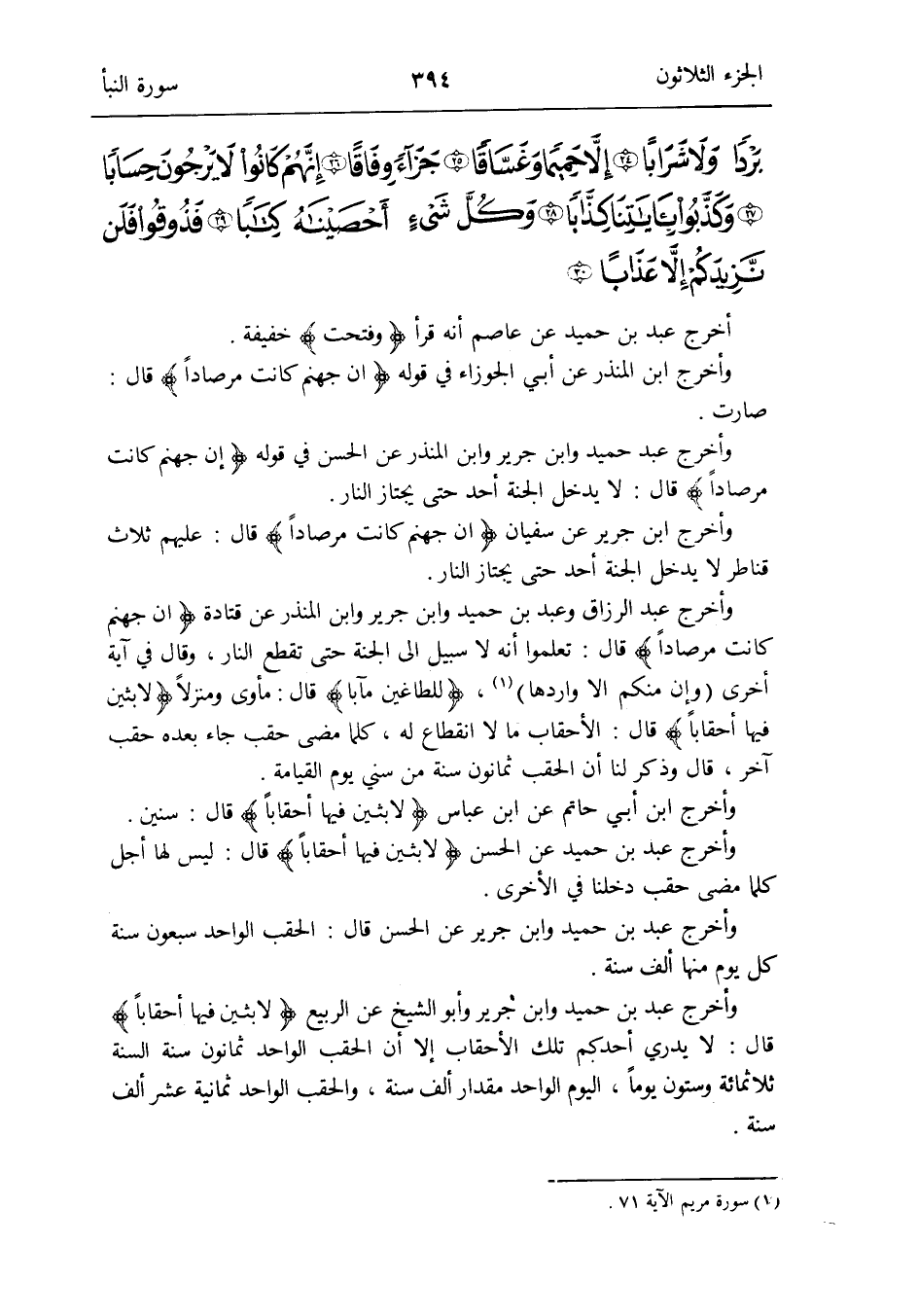 وَأخرج عبد الرَّزَّاق وَعبد بن حميد وَابْن جرير وَابْن الْمُنْذر عَن قَتَادَة {إِن جَهَنَّم كَانَت مرصاداً} قَالَ: تعلمُوا أَنه لَا سَبِيل إِلَى الْجنَّة حَتَّى تقطع النَّار وَقَالَ فِي آيَة أُخْرَى: (وَإِن مِنْكُم إِلَّا واردها) (سُورَة مَرْيَم الْآيَة 71) {للطاغين مآباً} قَالَ: مأوى ومنزلاً {لابثين فِيهَا أحقاباً} قَالَ: الأحقاب مَا لَا انْقِطَاع لَهُ كلما مضى حقب جَاءَ بعده حقب آخر قَالَ وَذكر لنا أَن الحقب ثَمَانُون سنة من سني يَوْم الْقِيَامَة