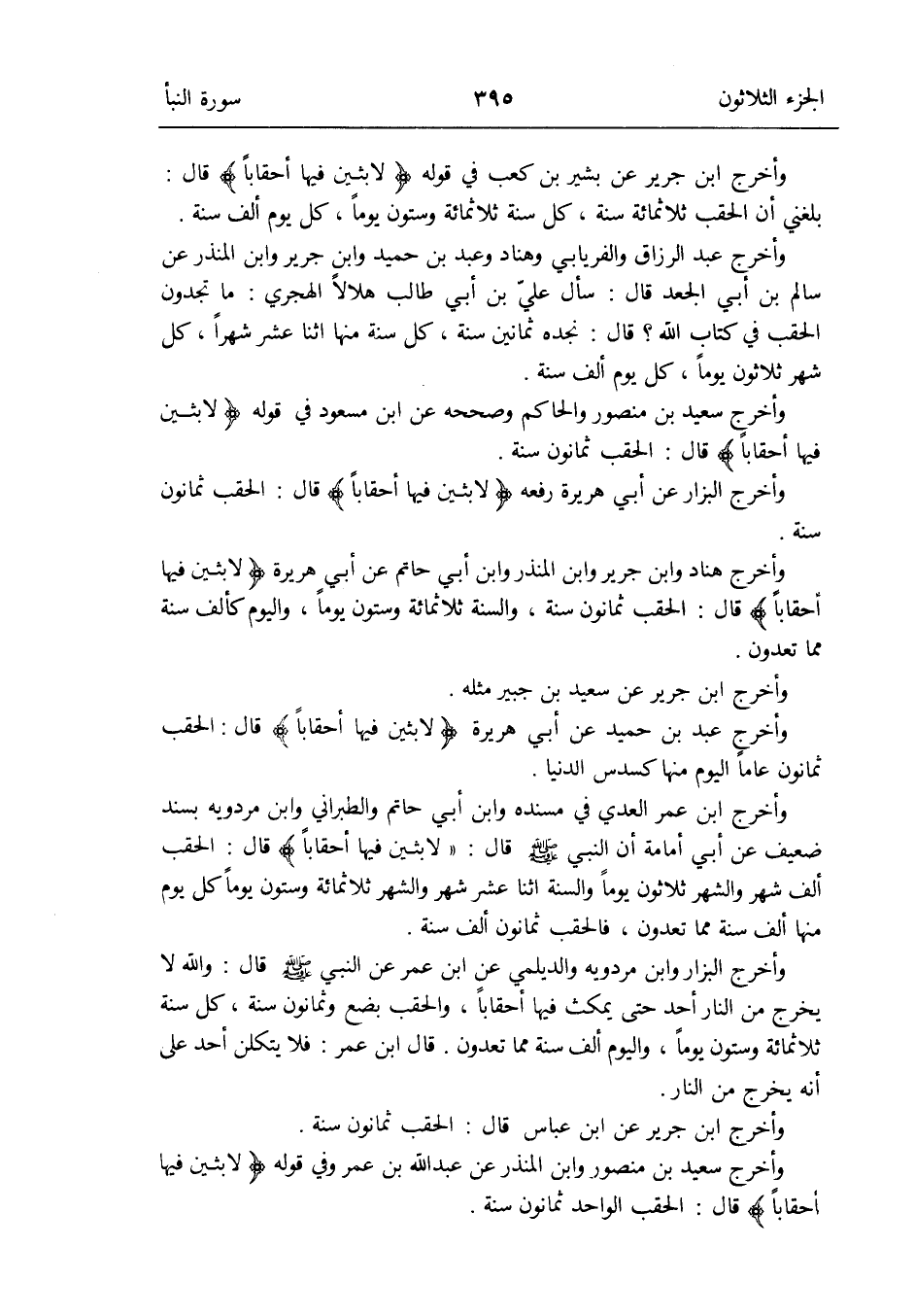 وَأخرج ابْن جرير عَن بشير بن كَعْب فِي قَوْله: {لابثين فِيهَا أحقاباً} قَالَ: بَلغنِي أَن الحقب ثَلَاثمِائَة سنة كل سنة ثَلَاثمِائَة وَسِتُّونَ يَوْمًا كل يَوْم ألف سنة