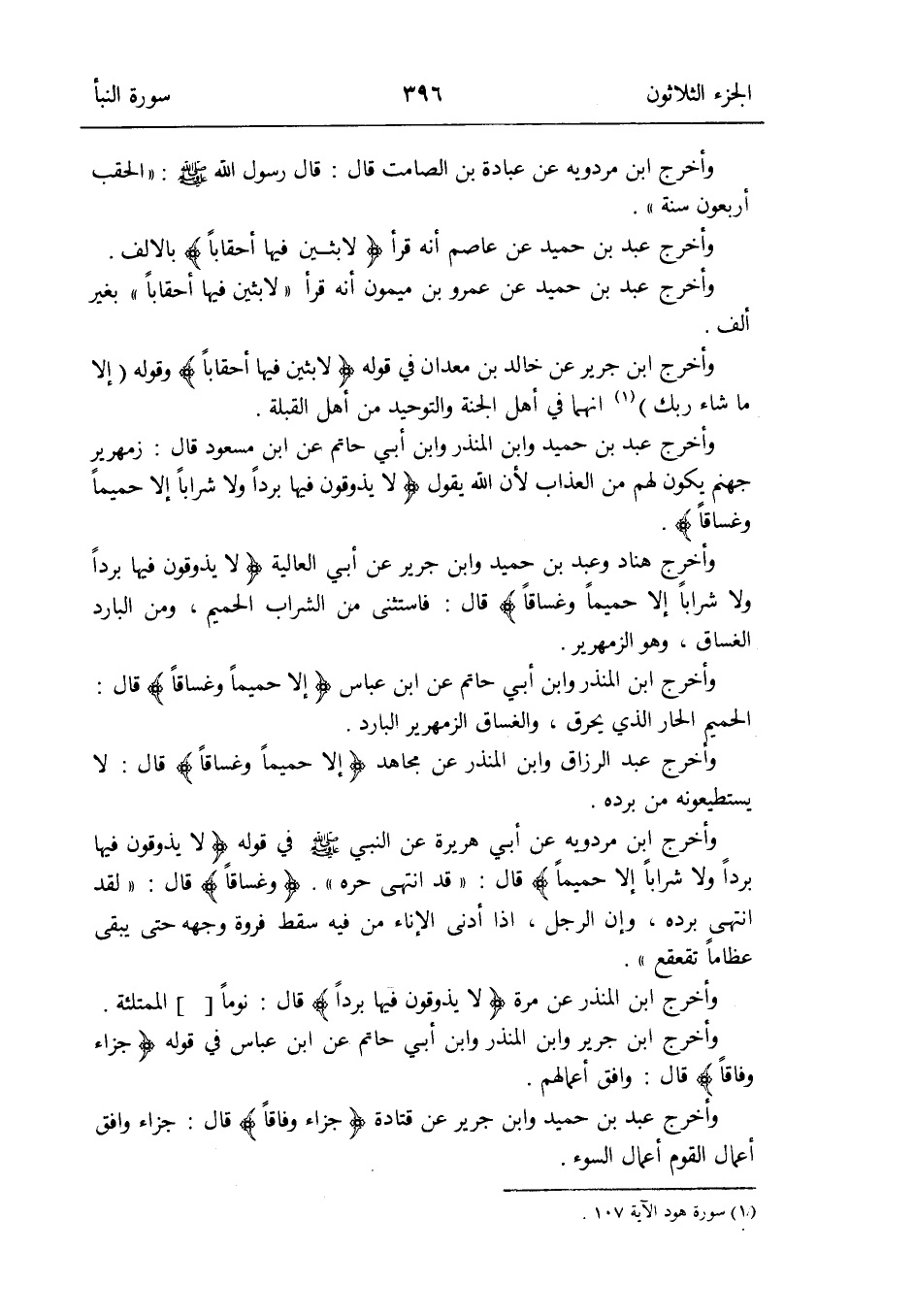 وَأخرج ابْن مرْدَوَيْه عَن أبي هُرَيْرَة عَن النَّبِي صلى الله عَلَيْهِ وَسلم فِي قَوْله: {لَا يذوقون فِيهَا بردا وَلَا شرابًا إِلَّا حميماً} قَالَ: قد انْتهى حره