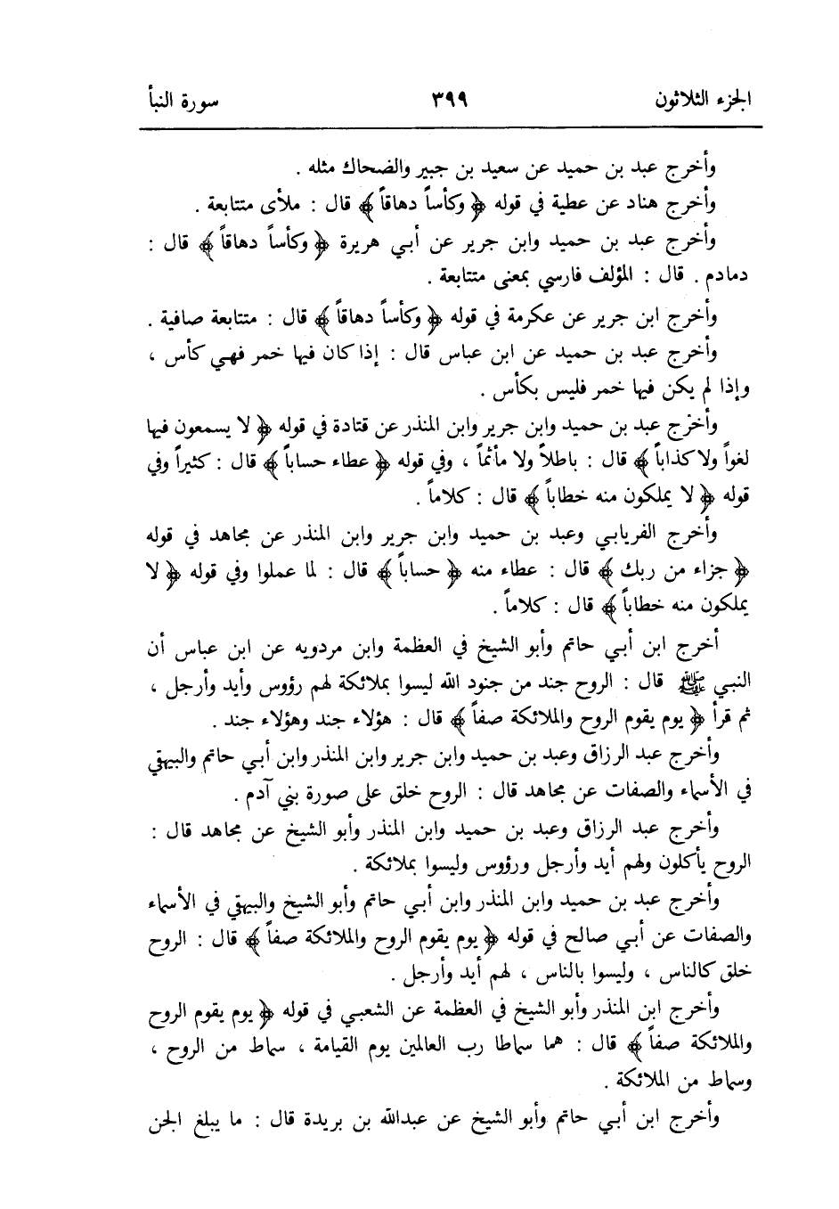 وَأخرج عبد بن حميد وَابْن جرير وَابْن الْمُنْذر عَن قَتَادَة فِي قَوْله: {لَا يسمعُونَ فِيهَا لَغوا وَلَا كذابا} قَالَ: بَاطِلا وَلَا مأثماً وَفِي قَوْله: {عَطاء حسابا} قَالَ: كثيرا وَفِي قَوْله: {لَا يملكُونَ مِنْهُ خطابا} قَالَ: كلَاما