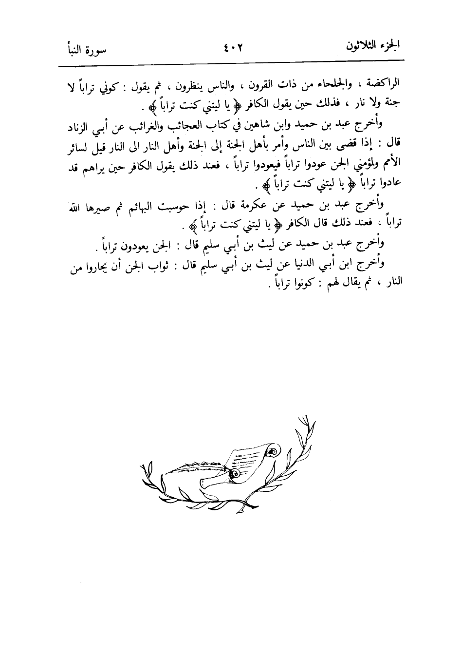 وَأخرج عبد بن حميد وَابْن شاهين فِي كتاب الْعَجَائِب الغرائب عَن أبي الزِّنَاد قَالَ: إِذا قضى بَين النَّاس وَأمر بِأَهْل الْجنَّة إِلَى الْجنَّة وَأهل النَّار إِلَى النَّار قيل لسَائِر الْأُمَم ولمؤمني الْجِنّ عودوا تُرَابا فيعودوا تُرَابا فَعِنْدَ ذَلِك يَقُول الْكَافِر حِين يراهم قد عَادوا تُرَابا: {يَا لَيْتَني كنت تُرَابا}