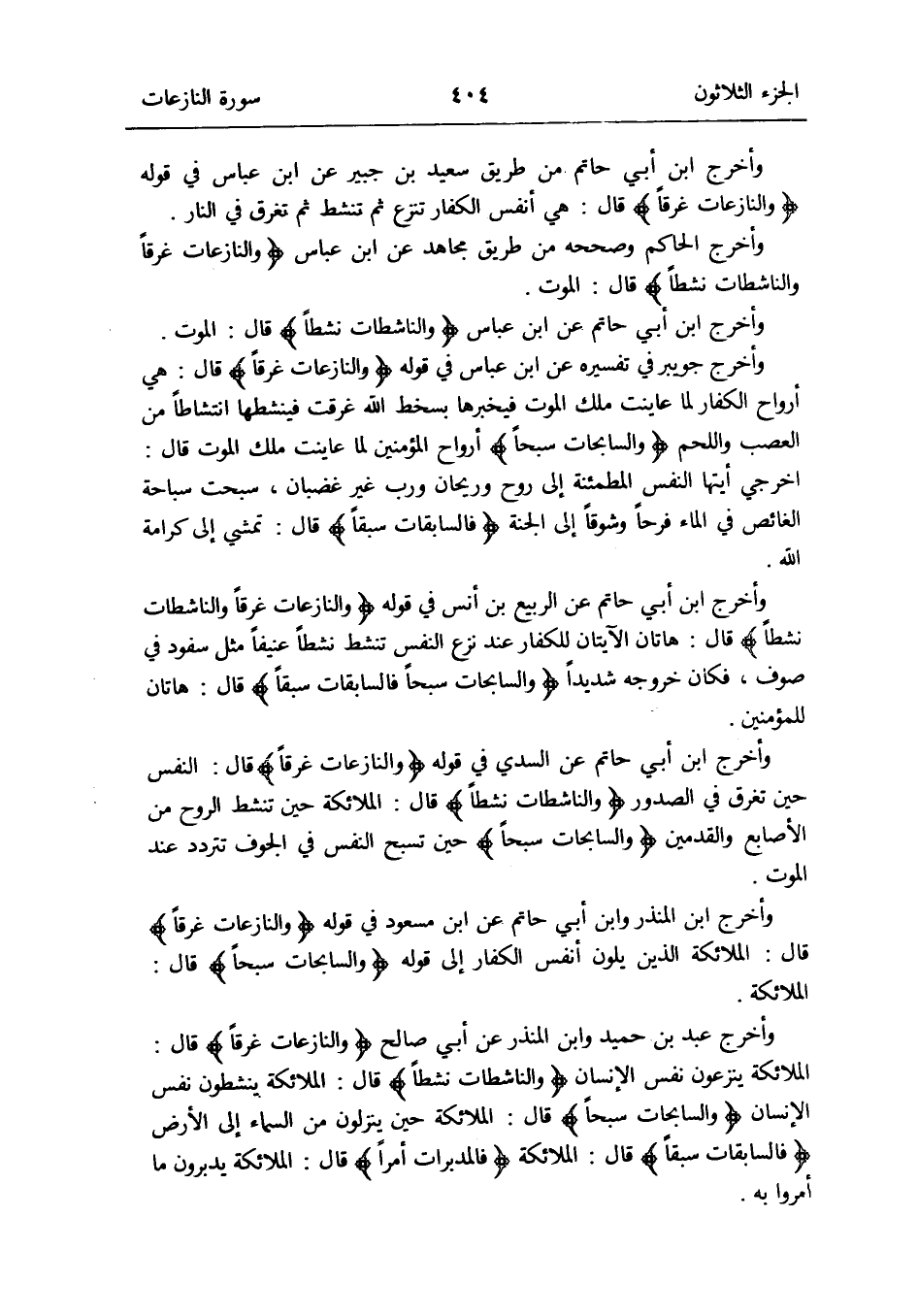 وَأخرج ابْن الْمُنْذر وَابْن أبي حَاتِم عَن ابْن مَسْعُود فِي قَوْله: {والنازعات غرقاً} قَالَ: الْمَلَائِكَة الَّذين يلون أنفس الْكفَّار إِلَى قَوْله: {والسابحات سبحاً} قَالَ: الْمَلَائِكَة