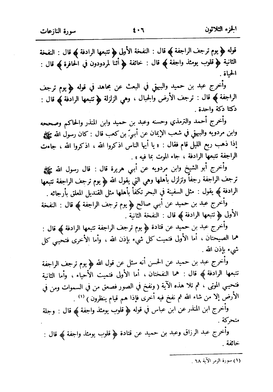 وَأخرج عبد بن حميد عَن الْحسن أَنه سُئِلَ عَن قَول الله {يَوْم ترجف الراجفة تتبعها الرادفة} قَالَ: هما النفختان أما الأولى فتميت الْأَحْيَاء وَأما الثَّانِيَة فتحيي الْمَوْتَى ثمَّ تَلا هَذِه الْآيَة (وَنفخ فِي الصُّور فَصعِقَ من فِي السَّمَوَات وَمن فِي الأَرْض إِلَّا من شَاءَ الله ثمَّ نفخ فِيهِ أُخْرَى فَإِذا هم قيام ينظرُونَ) (سُورَة الزمر الْآيَة 68)