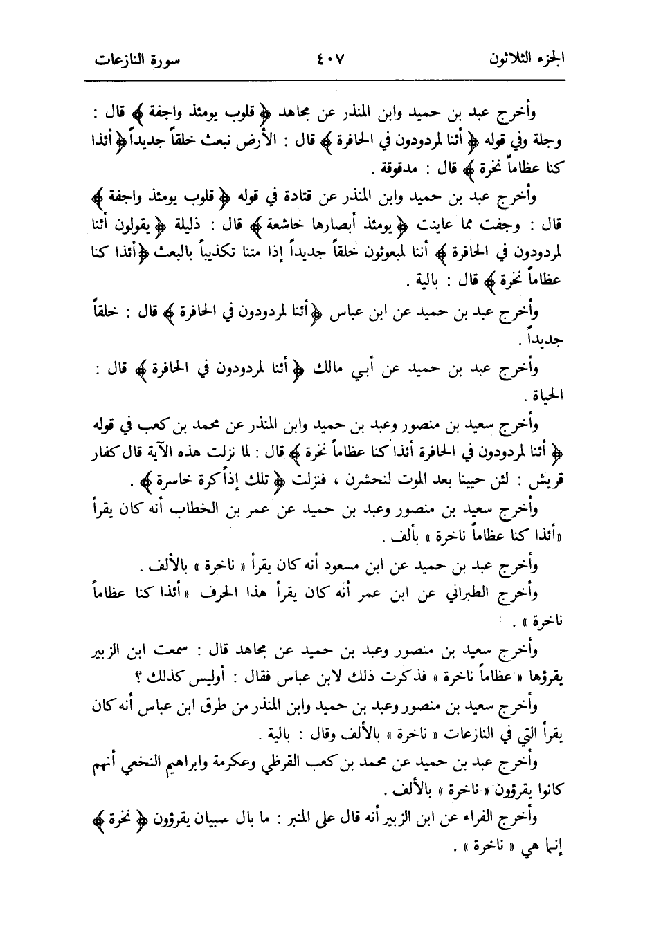 وَأخرج سعيد بن مَنْصُور وَعبد بن حميد عَن مُجَاهِد قَالَ: سَمِعت ابْن الزبير يقْرؤهَا عظاماً ناخرة فَذكرت ذَلِك لِابْنِ عَبَّاس فَقَالَ: أوليس كَذَلِك وَأخرج سعيد بن مَنْصُور وَعبد بن حميد وَابْن الْمُنْذر من طرق ابْن عَبَّاس أَنه كَانَ يقْرَأ الَّتِي فِي النازعات ناخرة بِالْألف وَقَالَ: بالية