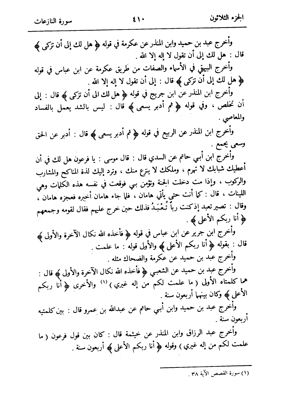 وَأخرج ابْن الْمُنْذر عَن ابْن جريج فِي قَوْله: {هَل لَك إِلَى أَن تزكّى} قَالَ: إِلَى أَن تخلص وَفِي قَوْله: {ثمَّ أدبر يسْعَى} قَالَ: لَيْسَ بالشد يعْمل بِالْفَسَادِ والمعاصي