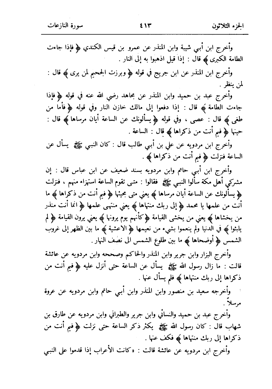 وَأخرج الْبَزَّار وَابْن جرير وَابْن الْمُنْذر وَالْحَاكِم وَصَححهُ وَابْن مرْدَوَيْه عَن عَائِشَة قَالَت: مازال رَسُول الله صلى الله عَلَيْهِ وَسلم يسْأَل عَن السَّاعَة حَتَّى أنزل عَلَيْهِ {فيمَ أَنْت من ذكرَاهَا إِلَى رَبك مُنْتَهَاهَا} فَلم يسْأَل عَنْهَا