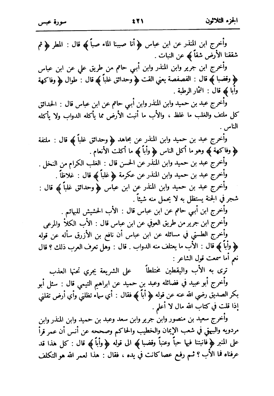 وَأخرج ابْن جرير من طَرِيق الْعَوْفِيّ عَن ابْن عَبَّاس قَالَ: الْأَب الْكلأ والمرعى