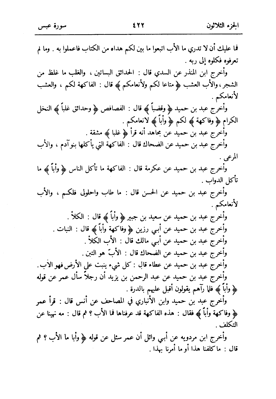 وَأخرج عبد بن حميد وَابْن الْأَنْبَارِي فِي الْمَصَاحِف عَن أنس قَالَ: قَرَأَ عمر {وَفَاكِهَة وَأَبا} فَقَالَ: هَذِه الْفَاكِهَة قد عرفناها فَمَا الْأَب ثمَّ قَالَ: مَه نهينَا عَن التَّكَلُّف