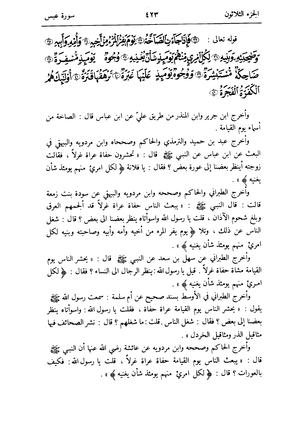 وَأخرج عبد بن حميد وَالتِّرْمِذِيّ وَالْحَاكِم وصححاه وَابْن مرْدَوَيْه وَالْبَيْهَقِيّ فِي الْبَعْث عَن ابْن عَبَّاس عَن النَّبِي صلى الله عَلَيْهِ وَسلم قَالَ: تحشرون حُفَاة عُرَاة غرلًا فَقَالَت زَوجته: أينظر بَعْضنَا إِلَى عُرْوَة بعض فَقَالَ: يَا فُلَانَة {لكل امْرِئ مِنْهُم يَوْمئِذٍ شَأْن يُغْنِيه}