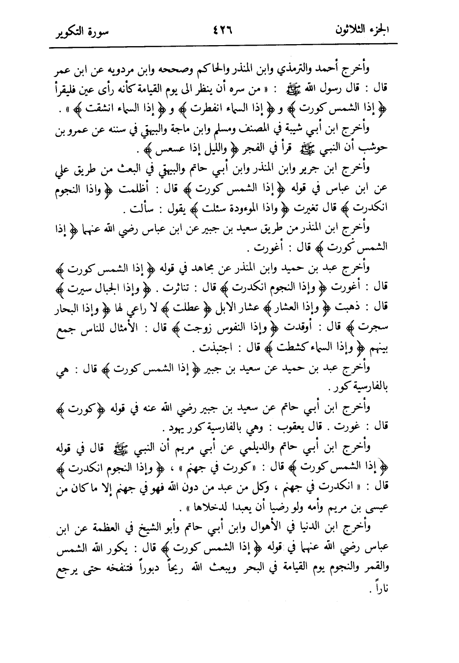 وَأخرج أَحْمد وَالتِّرْمِذِيّ وَابْن الْمُنْذر وَالْحَاكِم وَصَححهُ وَابْن مرْدَوَيْه عَن ابْن عمر قَالَ: قَالَ رَسُول الله صلى الله عَلَيْهِ وَسلم: من سره أَن ينظر إِلَى يَوْم الْقِيَامَة كَأَنَّهُ رَأْي عين فليقرأ {إِذا الشَّمْس كورت} و {إِذا السَّمَاء انفطرت} و {إِذا السَّمَاء انشقت}