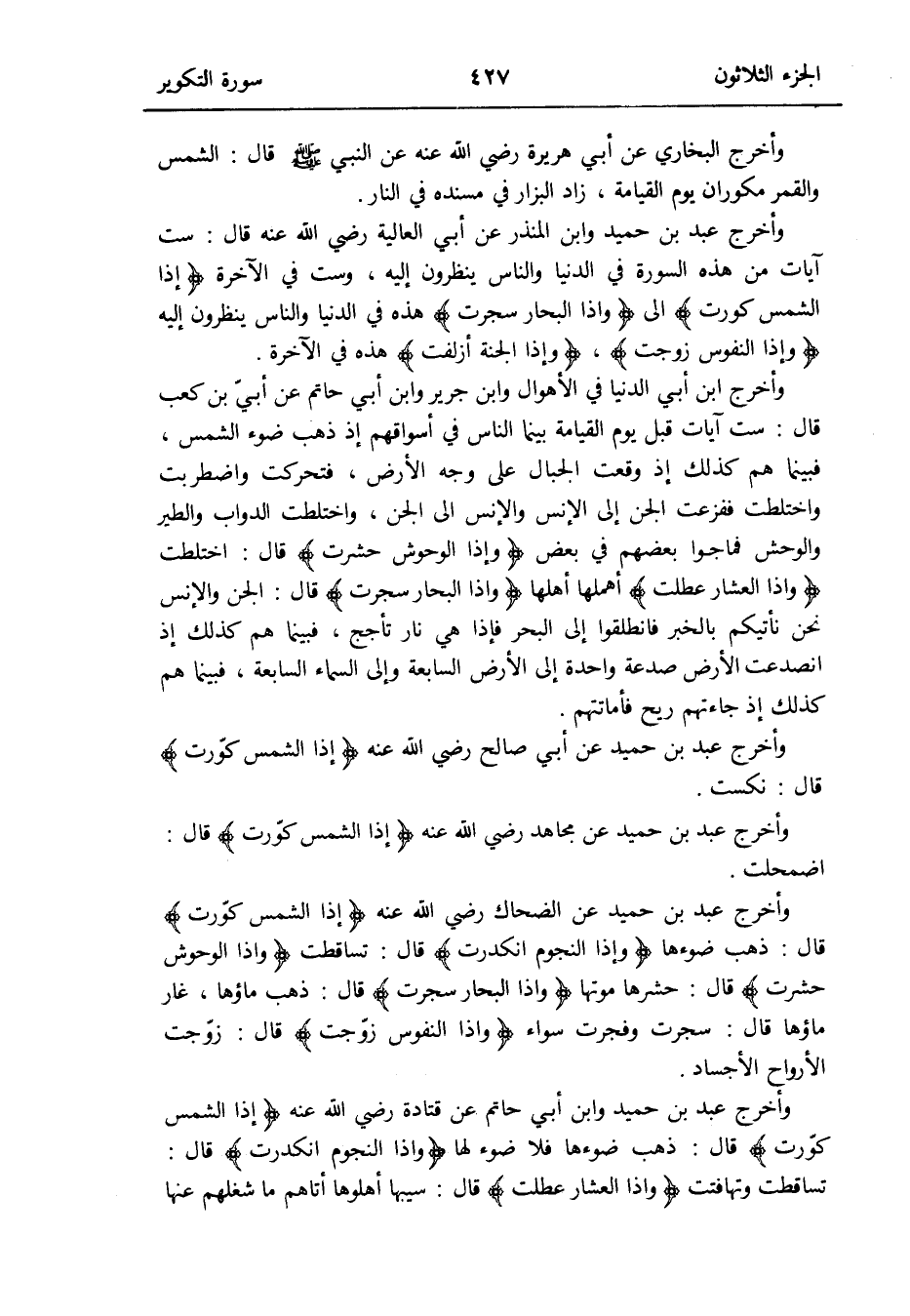 وَأخرج عبد بن حميد وَابْن أبي حَاتِم عَن قَتَادَة رَضِي الله عَنهُ {إِذا الشَّمْس كوّرت} قَالَ: ذهب ضوءها فَلَا ضوء لَهَا {وَإِذا النُّجُوم انكدرت} قَالَ: تساقطت وتهافتت {وَإِذا العشار عطلت} قَالَ: سيبها أهلوها أَتَاهُم مَا شغلهمْ عَنْهَا