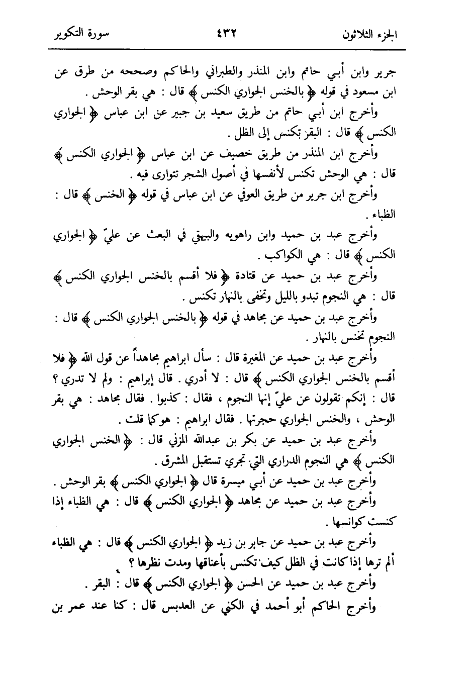 جرير وَابْن أبي حَاتِم وَابْن الْمُنْذر وَالطَّبَرَانِيّ وَالْحَاكِم وَصَححهُ من طرق عَن ابْن مَسْعُود فِي قَوْله: {بالخنس الْجوَار الكنس} قَالَ: هِيَ بقر الْوَحْش
