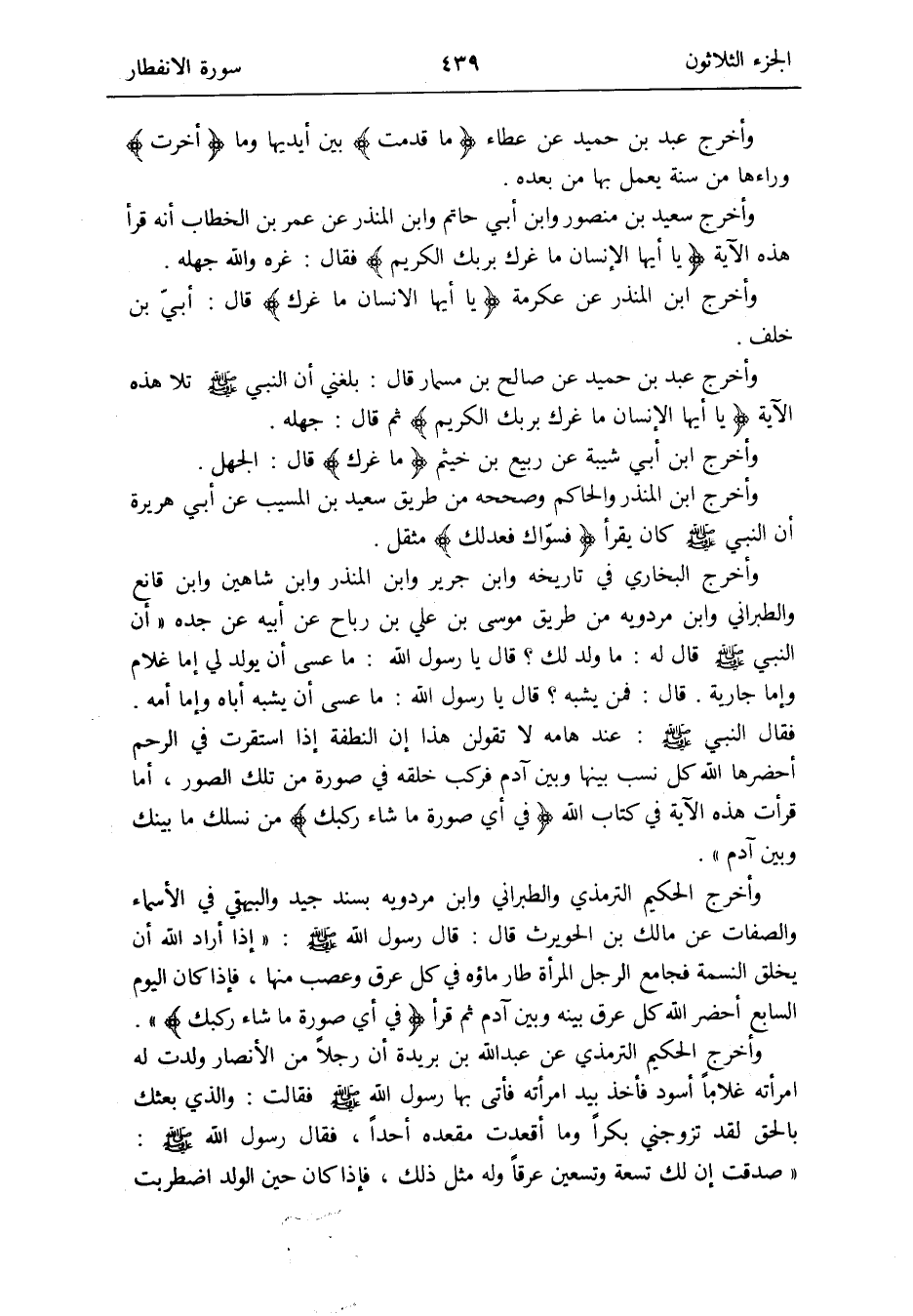 وَأخرج عبد بن حميد عَن صَالح بن مِسْمَار قَالَ: بَلغنِي أَن النَّبِي صلى الله عَلَيْهِ وَسلم تَلا هَذِه الْآيَة {يَا أَيهَا الإِنسان مَا غَرَّك بِرَبِّك الْكَرِيم} ثمَّ قَالَ: جَهله