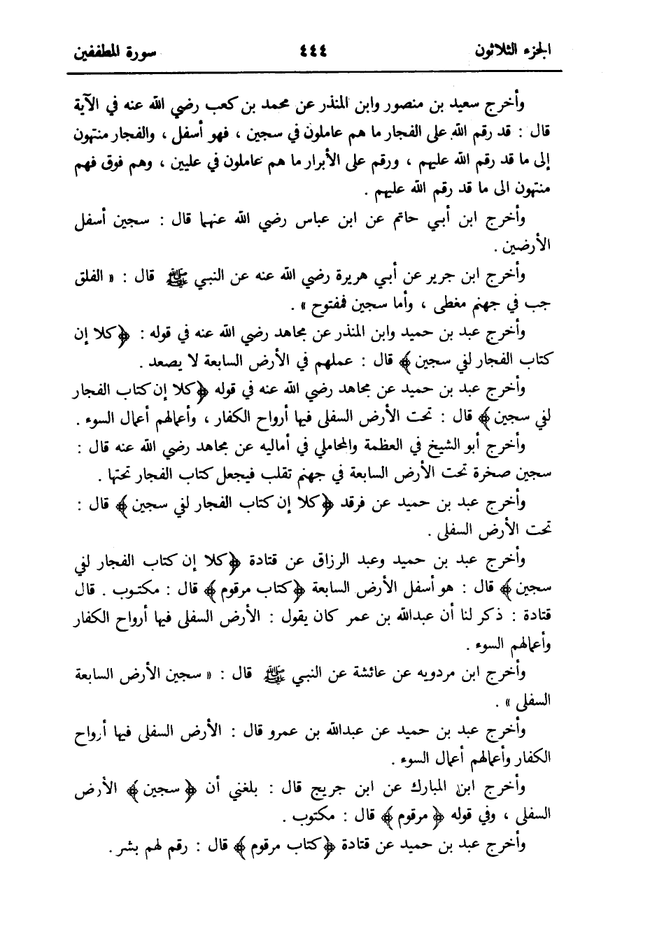 وَأخرج ابْن الْمُبَارك عَن ابْن جريج قَالَ: بَلغنِي أَن {سِجِّين} الأَرْض السلفى وَفِي قَوْله: {مرقوم} قَالَ: مَكْتُوب