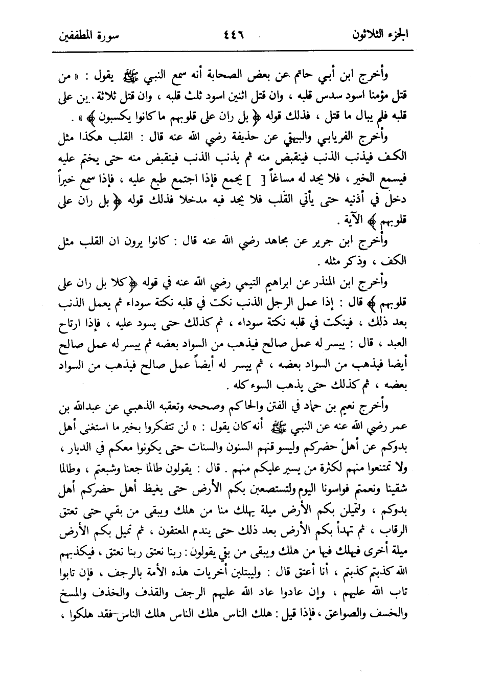 وَأخرج ابْن أبي حَاتِم عَن بعض الصَّحَابَة أَنه سمع النَّبِي صلى الله عَلَيْهِ وَسلم يَقُول: من قتل مُؤمنا أسودَّ سدس قلبه وَإِن قتل اثْنَيْنِ أسود ثلث قلبه وَإِن قتل ثَلَاثَة رين على قلبه فَلم يبال مَا قتل فَذَلِك قَوْله: {بل ران على قُلُوبهم مَا كَانُوا يَكْسِبُونَ}