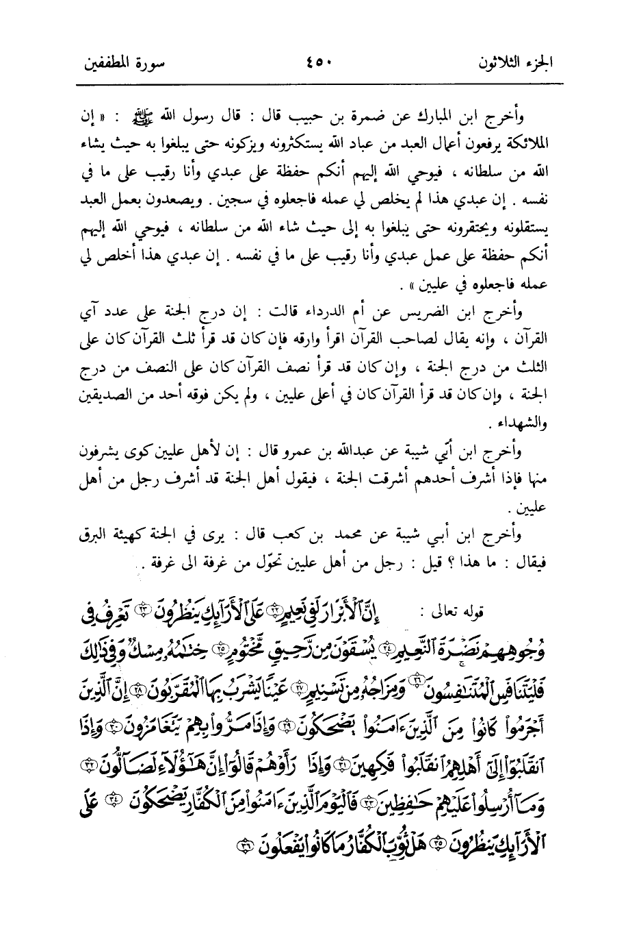 وَأخرج ابْن الْمُبَارك عَن ضَمرَة بن حبيب قَالَ: قَالَ رَسُول الله صلى الله عَلَيْهِ وَسلم: إِن الْمَلَائِكَة يرفعون أَعمال العَبْد من عباد الله يستكثرونه ويزكونه حَتَّى يبلغُوا بِهِ حَيْثُ يَشَاء الله من سُلْطَانه فَيُوحِي الله إِلَيْهِم أَنكُمْ حفظَة على عَبدِي وَأَنا رَقِيب على مَا فِي نَفسه