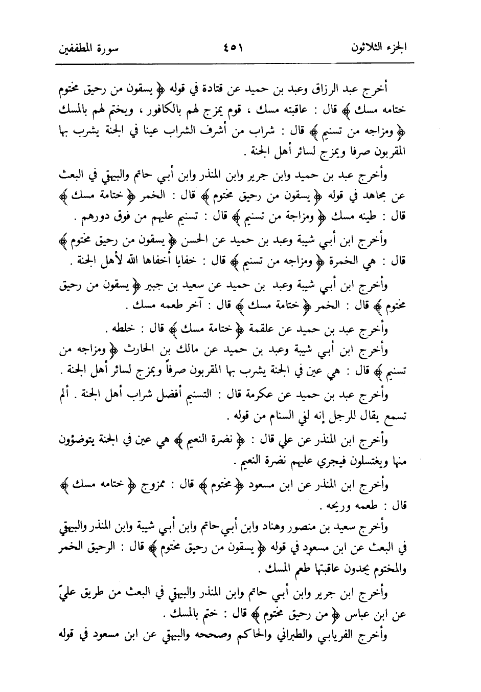 وَأخرج ابْن جرير وَابْن أبي حَاتِم وَابْن الْمُنْذر وَالْبَيْهَقِيّ فِي الْبَعْث من طَرِيق عَليّ عَن ابْن عَبَّاس {من رحيق مختوم} قَالَ: ختم بالمسك