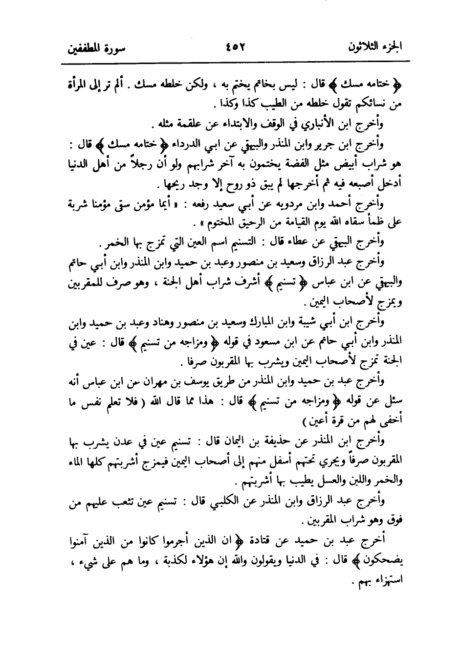 وَأخرج ابْن أبي شيبَة وَابْن الْمُبَارك وَسَعِيد بن مَنْصُور وهناد وَعبد بن حميد وَابْن الْمُنْذر وَابْن أبي حَاتِم عَن ابْن مَسْعُود فِي قَوْله: {ومزاجه من تسنيم} قَالَ: عين فِي الْجنَّة تمزج لأَصْحَاب الْيَمين وَيشْرب بهَا المقربون صرفا