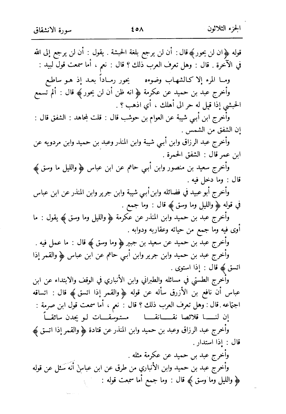 قَالَ: وَهل تعرف الْعَرَب ذَلِك قَالَ: نعم أما سَمِعت قَول لبيد: وَمَا الْمَرْء إِلَّا كالشهاب وضوءه يحور رَمَادا بعد إِذْ هُوَ سَاطِع وَأخرج عبد بن حميد عَن عِكْرِمَة {إِنَّه ظن أَن لن يحور} قَالَ: ألم تسمع الحبشي إِذا قيل لَهُ حر إِلَى أهلك أَي اذْهَبْ