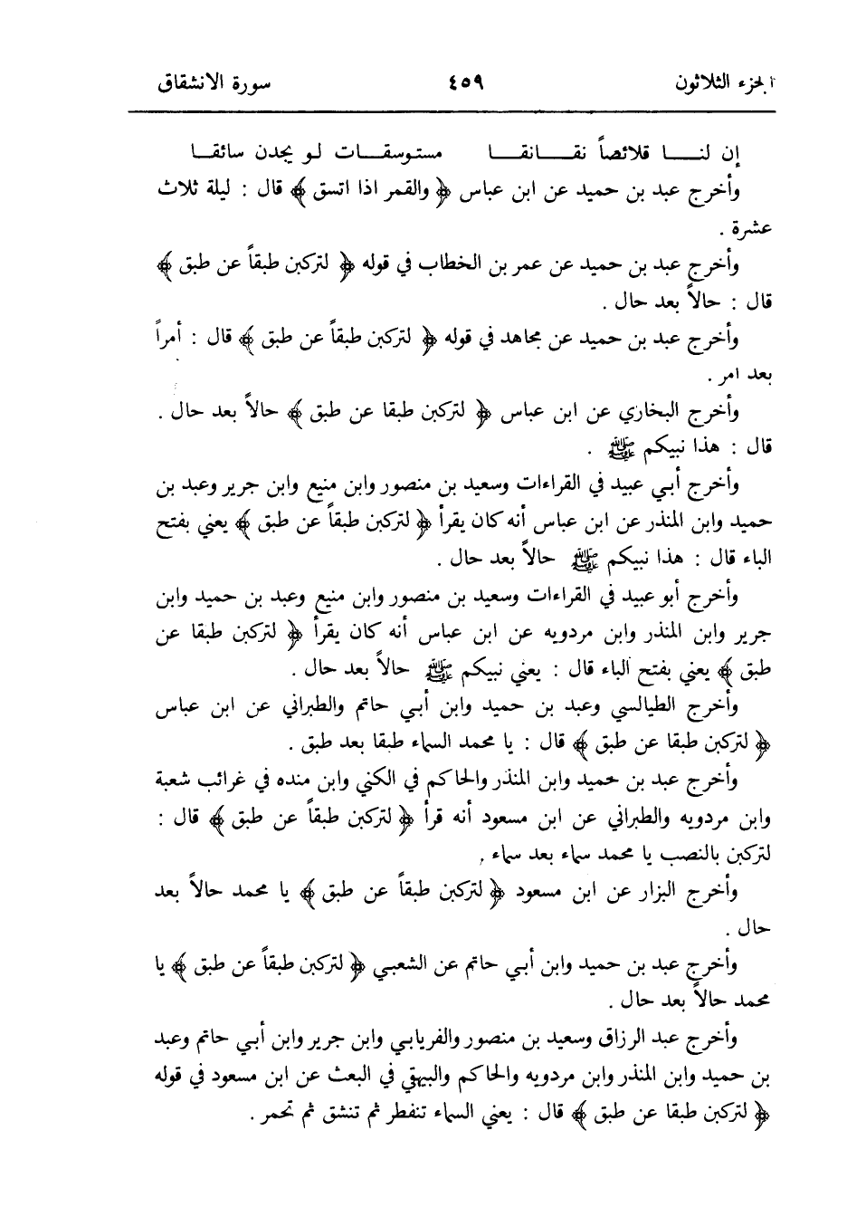 وَأخرج أبي عبيد فِي الْقرَاءَات وَسَعِيد بن مَنْصُور وَابْن منيع وَابْن جرير وَعبد بن حميد وَابْن الْمُنْذر عَن ابْن عَبَّاس أَنه كَانَ يقْرَأ {لتركبن طبقًا عَن طبق} يَعْنِي بِفَتْح الْبَاء قَالَ: هَذَا نَبِيكُم صلى الله عَلَيْهِ وَسلم حَالا بعد حَال