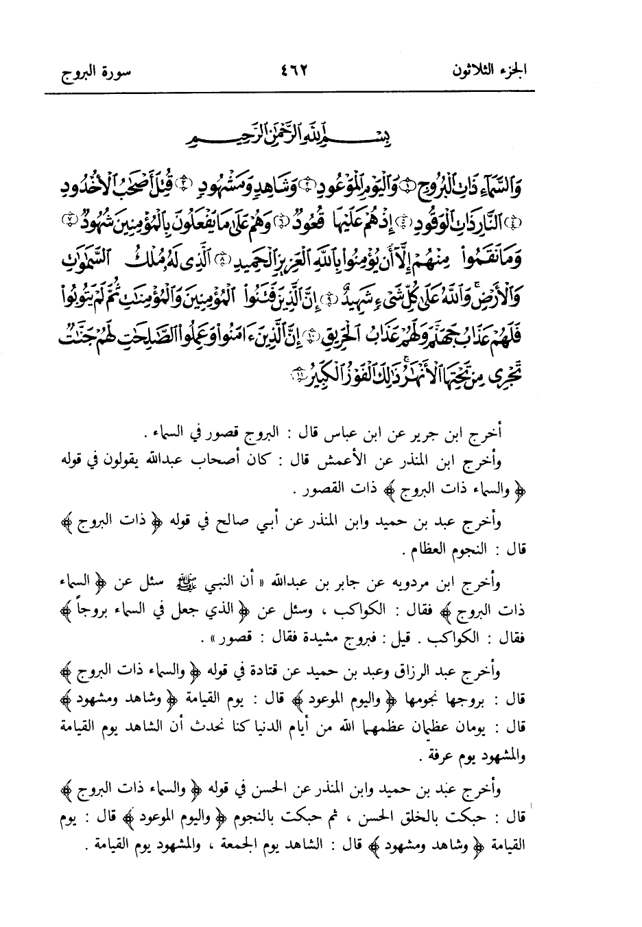 وَأخرج عبد الرَّزَّاق وَعبد بن حميد عَن قَتَادَة فِي قَوْله: {وَالسَّمَاء ذَات البروج} قَالَ: بروجها نجومها {وَالْيَوْم الْمَوْعُود} قَالَ: يَوْم الْقِيَامَة {وَشَاهد ومشهود} قَالَ: يَوْمَانِ عظيمان عظمهما الله من أَيَّام الدُّنْيَا كُنَّا نُحدث أَن الشَّاهِد يَوْم الْقِيَامَة والمشهود يَوْم عَرَفَة