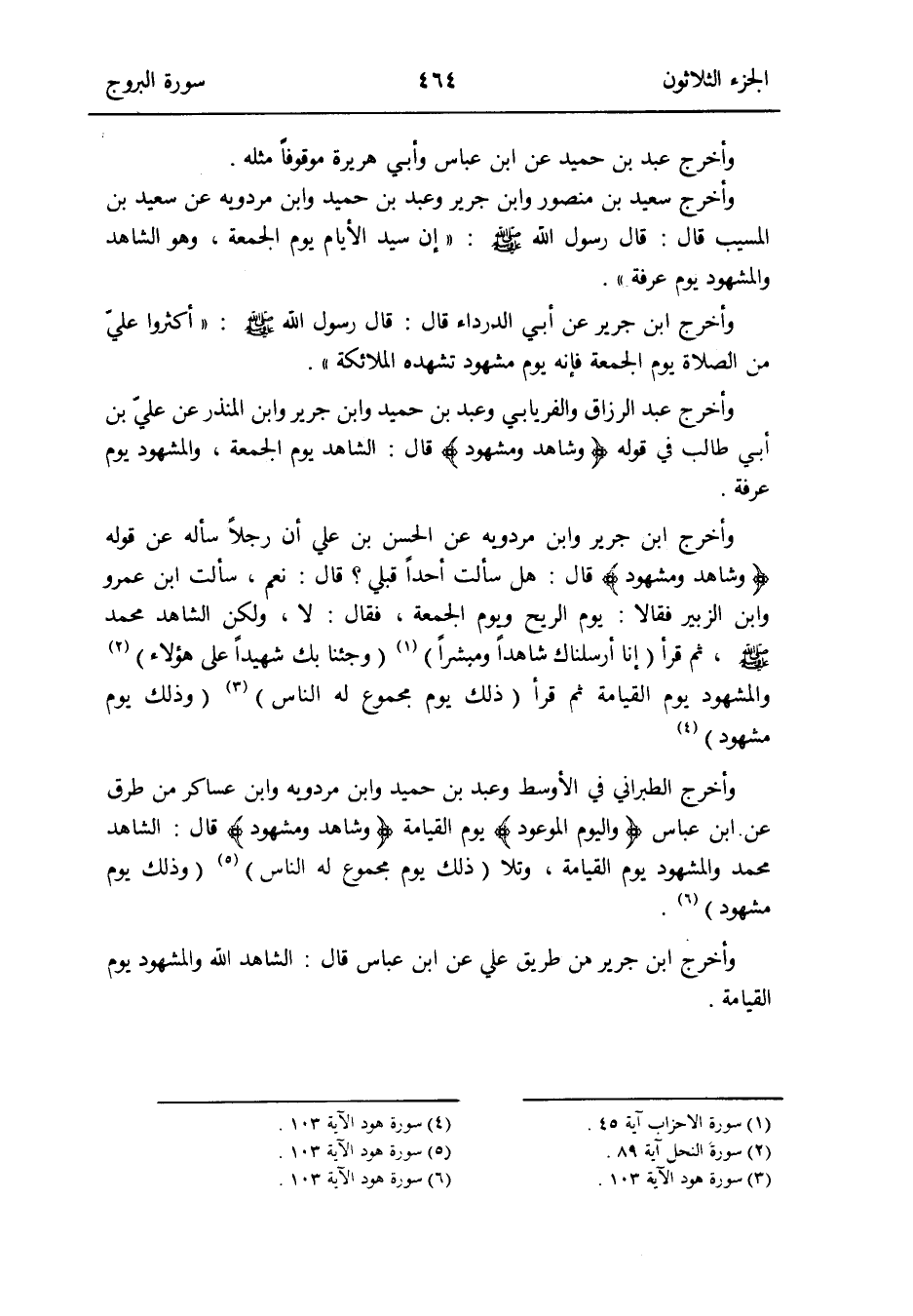 وَأخرج الطَّبَرَانِيّ فِي الْأَوْسَط وَعبد بن حميد وَابْن مرْدَوَيْه وَابْن عَسَاكِر من طرق عَن ابْن عَبَّاس {وَالْيَوْم الْمَوْعُود} يَوْم الْقِيَامَة {وَشَاهد ومشهود} قَالَ: الشَّاهِد مُحَمَّد والمشهود يَوْم الْقِيَامَة وتلا (ذَلِك يَوْم مَجْمُوع لَهُ النَّاس) (سُورَة هود الْآيَة 103) (وَذَلِكَ يَوْم مشهود) (سُورَة هود الْآيَة 103) وَأخرج ابْن جرير من طَرِيق عَليّ عَن ابْن عَبَّاس قَالَ: الشَّاهِد الله والمشهود يَوْم الْقِيَامَة