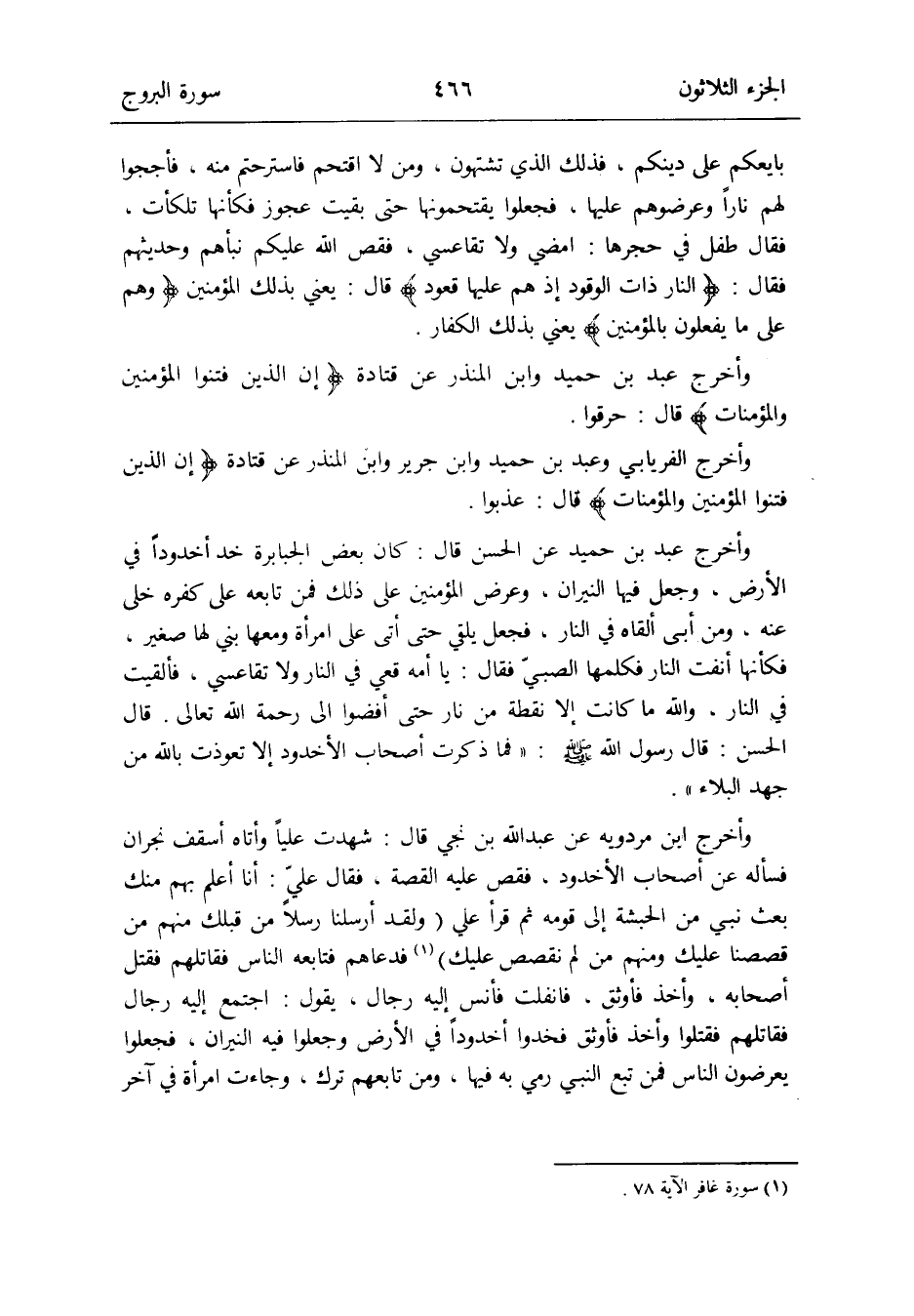 بايعكم على دينكُمْ فَذَلِك الَّذِي تشتهون وَمن لَا اقتحم فاسترحتم مِنْهُ فأججوا لَهُم نَارا وعرضوهم عَلَيْهَا فَجعلُوا يقتحمونها حَتَّى بقيت عَجُوز فَكَأَنَّهَا تلكأت فَقَالَ طِفْل فِي حجرها: امْضِي وَلَا تقاعسي فَقص الله عَلَيْكُم نبأهم وحديثهم فَقَالَ: {النَّار ذَات الْوقُود إِذْ هم عَلَيْهَا قعُود} قَالَ: يَعْنِي بذلك الْمُؤمنِينَ {وهم على مَا يَفْعَلُونَ بِالْمُؤْمِنِينَ} يَعْنِي بذلك الْكفَّار