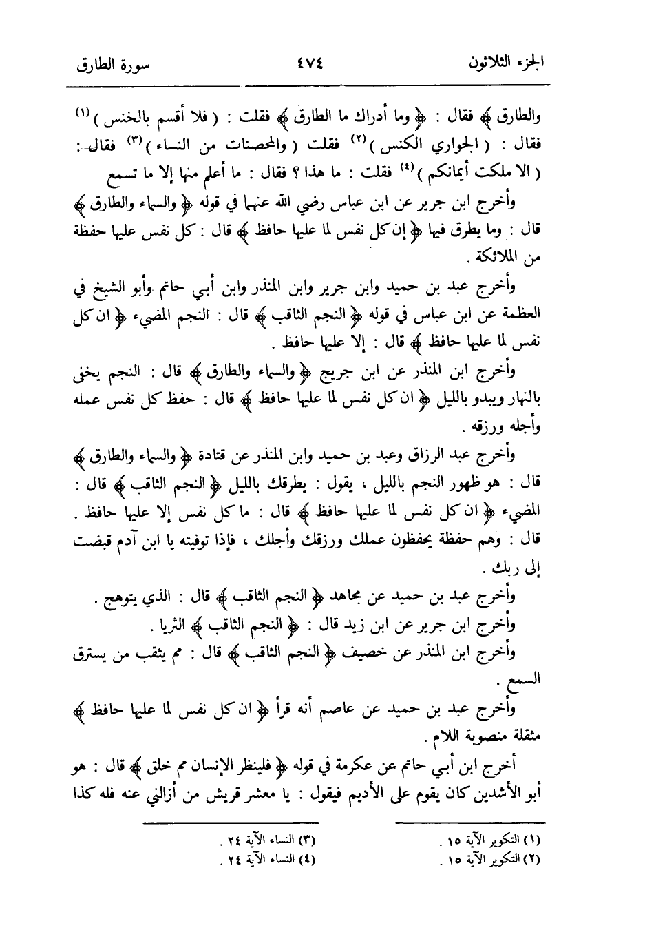 وَأخرج ابْن جرير عَن ابْن عَبَّاس رَضِي الله عَنْهُمَا فِي قَوْله: {وَالسَّمَاء والطارق} قَالَ: وَمَا يطْرق فِيهَا {إِن كل نفس لما عَلَيْهَا حَافظ} قَالَ: كل نفس عَلَيْهَا حفظَة من الْمَلَائِكَة