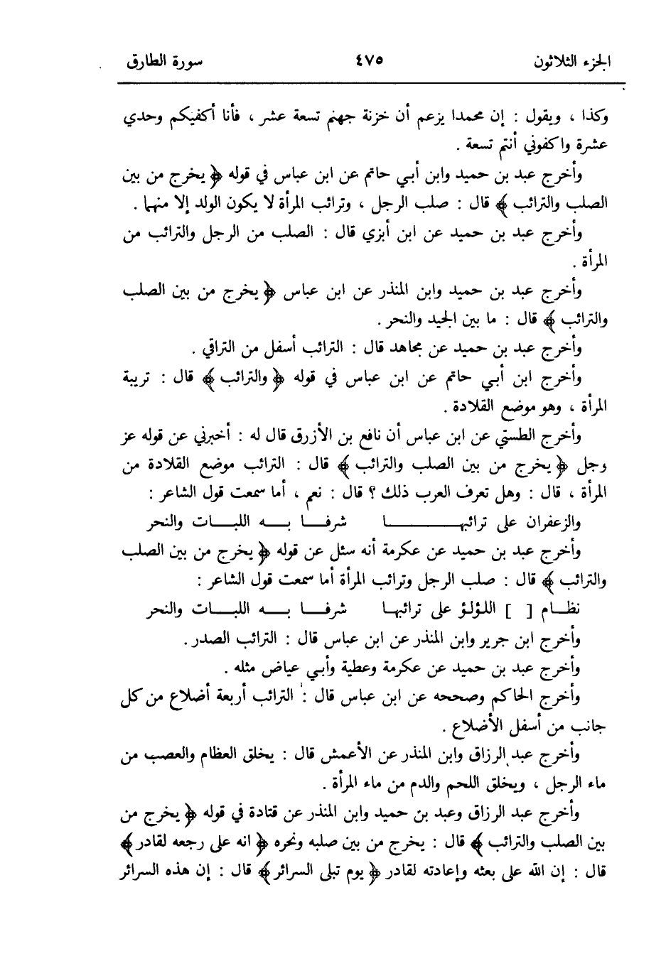 وَأخرج الطستي عَن ابْن عَبَّاس إِن نَافِع بن الْأَزْرَق قَالَ لَهُ: أَخْبرنِي عَن قَوْله: عزَّ وَجل {يخرج من بَين الصلب والترائب} قَالَ: الترائب مَوضِع القلادة من الْمَرْأَة قَالَ: وَهل تعرف الْعَرَب ذَلِك قَالَ نعم أما سَمِعت قَول الشَّاعِر: والزعفران على ترائبها شرفا بِهِ اللبات والنحر وَأخرج عبد بن حميد عَن عِكْرِمَة أَنه سُئِلَ عَن قَوْله: {يخرج من بَين الصلب والترائب} قَالَ: صلب الرجل وترائب الْمَرْأَة أما سَمِعت قَول الشَّاعِر: نظام [] اللُّؤْلُؤ على ترائبها شرفا بِهِ اللبات والنحر وَأخرج ابْن جرير وَابْن الْمُنْذر عَن ابْن عَبَّاس قَالَ: الترائب الصَّدْر