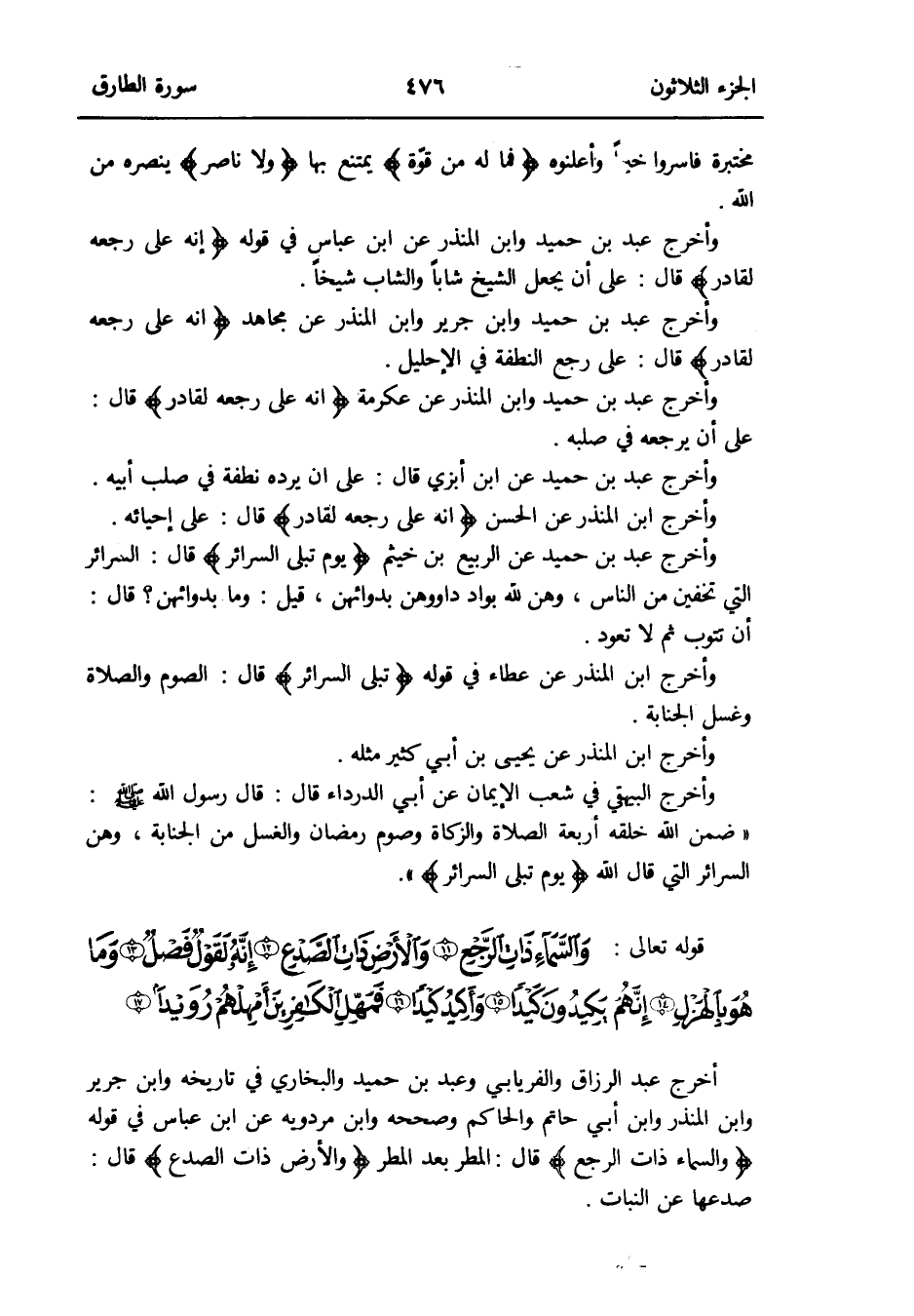 أخرج عبد الرَّزَّاق وَالْفِرْيَابِي وَعبد بن حميد وَالْبُخَارِيّ فِي تَارِيخه وَابْن جرير وَابْن الْمُنْذر وَابْن أبي حَاتِم وَالْحَاكِم وَصَححهُ وَابْن مرْدَوَيْه عَن ابْن عَبَّاس فِي قَوْله: {وَالسَّمَاء ذَات الرجع} قَالَ: الْمَطَر بعد الْمَطَر {وَالْأَرْض ذَات الصدع} قَالَ: صَدعهَا عَن النَّبَات